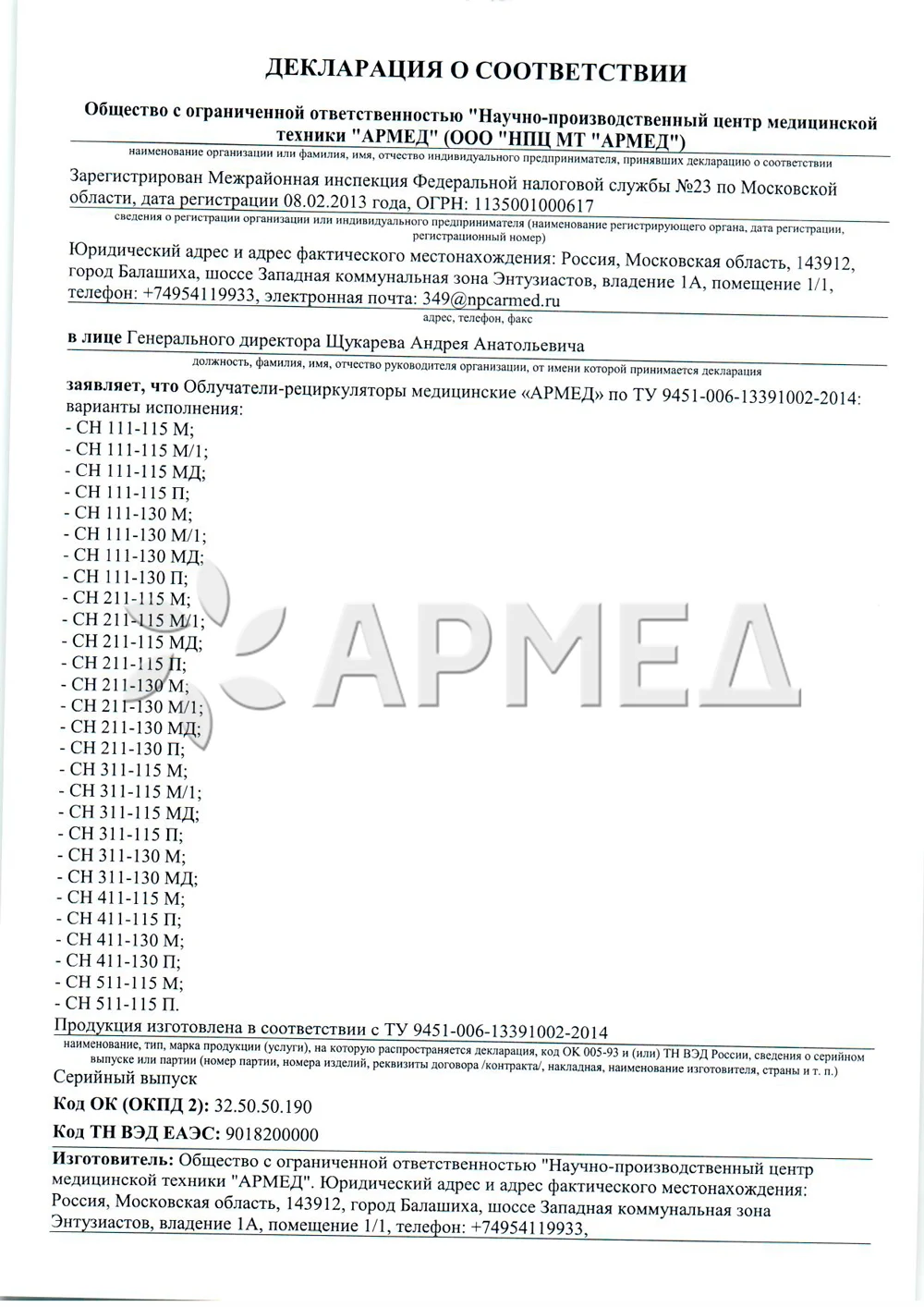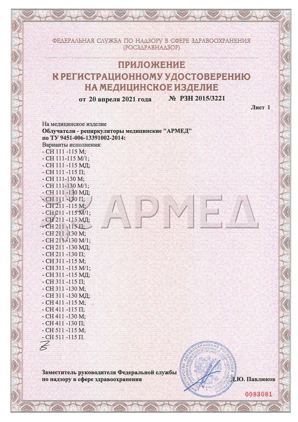 Облучатель-рециркулятор Армед является медицинским прибором и имеет регистрационное удостоверение. В результате ряда научных исследований НИИ Дезинфектологии Роспотребнадзора была доказана эффективность рециркуляторов Армед против инфекций. Устройства показали себя как надежный способ обеззараживания воздуха различных помещений в профилактических целях.