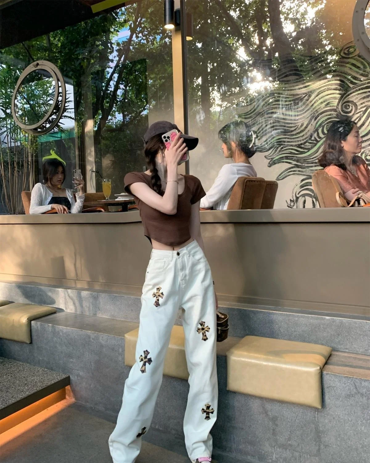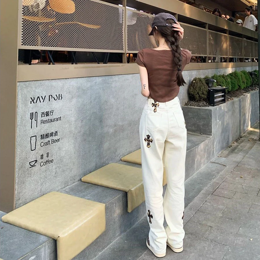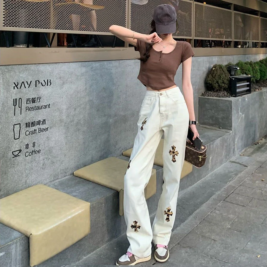 Уличная одежда, корейские модные женские прямые мешковатые брюки с завышенной талией Y2k, универсальные повседневные белые джинсовые брюки