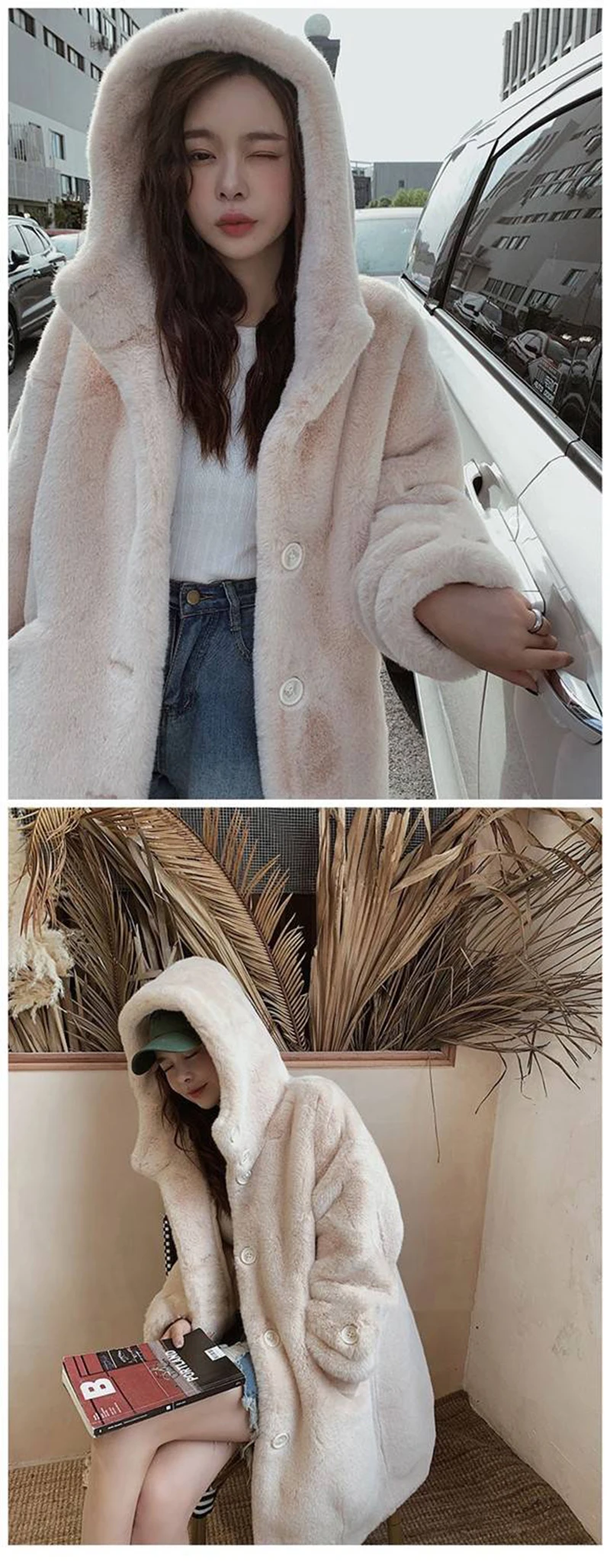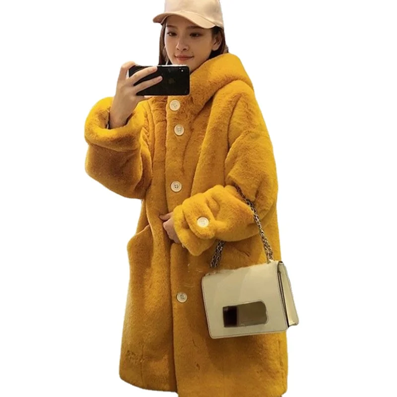 Новинка 2021, зимнее женское плотное теплое плюшевое пальто из искусственного кроличьего меха, Свободное длинное меховое пальто, пальто с капюшоном