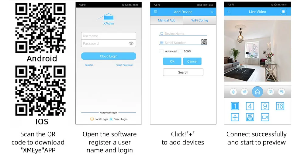 На основе технологии P2P (Peer To Peer), поддержка установки Plug-And-Play. Доступ к ip-камере через веб-интерфейс через Интернет-проводник, также поставляется с бесплатным приложением для смартфонов (Android и Iphone) для удаленного просмотра из любого места. Поддержка доступа к устройствам IOS и Android. Сканируйте qr-код для входа в систему. Загрузите бесплатное приложение в Apple App Store / Google Play.