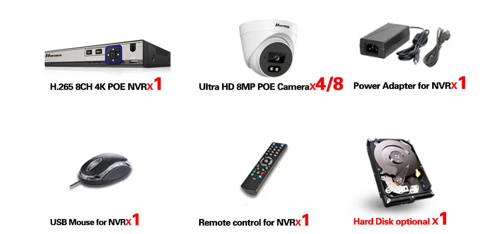 1 сетевой видеорегистратор 8CH 4K POE NVR;4/8 X HD POE IP 8.0MP Крытый Открытый ИК камеры дневного ночного видения;1 X Блок питания для NVR;1 х USB мышь для NVR;1 компакт-диск программного обеспечения для NVR;1 пульт дистанционного управления для NVR;Жесткий диск опционально!