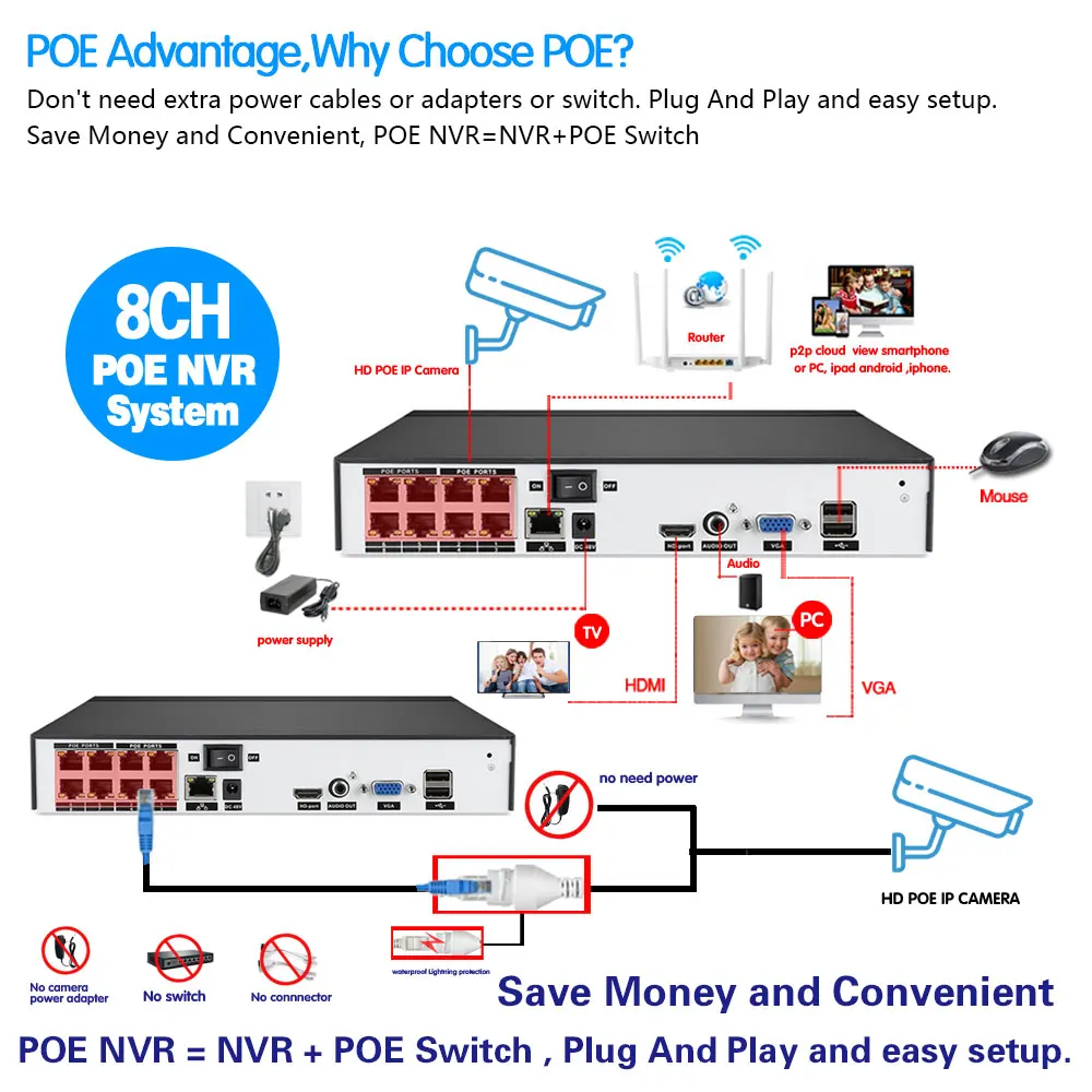 Нет дополнительных кабелей питания или адаптеров, просто подключив ip-камеру к NVR с помощью одного кабеля, вы можете легко завершить установку без знания о компьютере или сети и начать наслаждаться супер простым мониторингом среди вашего смартфона, планшета или ПК.Экономьте деньги и удобный POE NVR = NVR + POE коммутатор, подключи и работай и простая настройка!