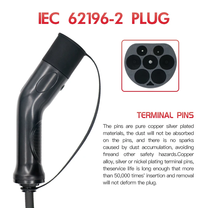 1. Разъем для зарядки: 7 контактов (соответствует стандарту IEC 62196-2)2. Длина шнура зарядного устройства: 5 м3. Номинальное напряжение: 220 ~ 250 В, 380 В ~ 450 в4. Номинальный ток: 16A ~ 32A5. Рабочая температура: -30 ℃ ~ + 55 ℃6. Рекомендуется использовать в помещении7. CE признанный компонент