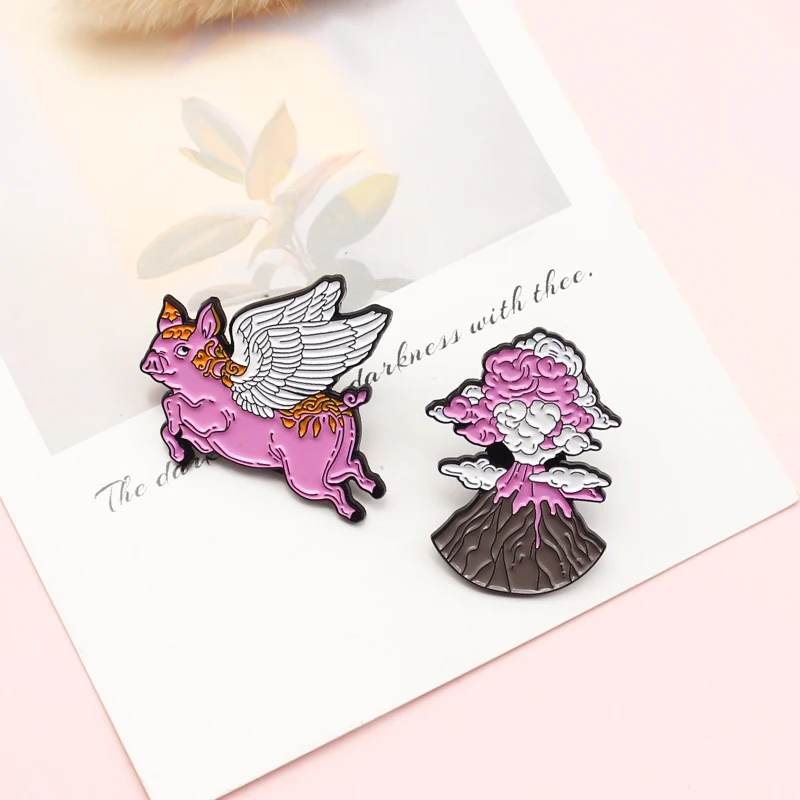 Эмалированная брошь в виде свиньи с розовыми крыльями ангела, извержение вулкана, мультяшное животное, забавная креативная бижутерия, значок на заказ