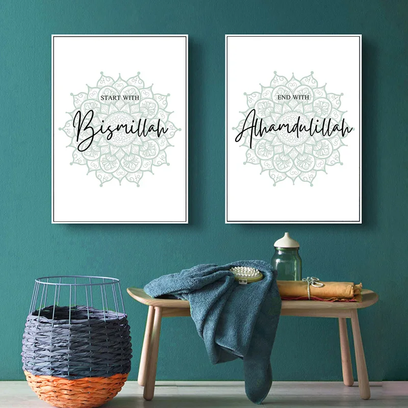 Исламский мусульманский Коран, постер с цитатами, Картина на холсте, арабская каллиграфия, настенное искусство, лотос, зеленые картины, печать для декора гостиной
