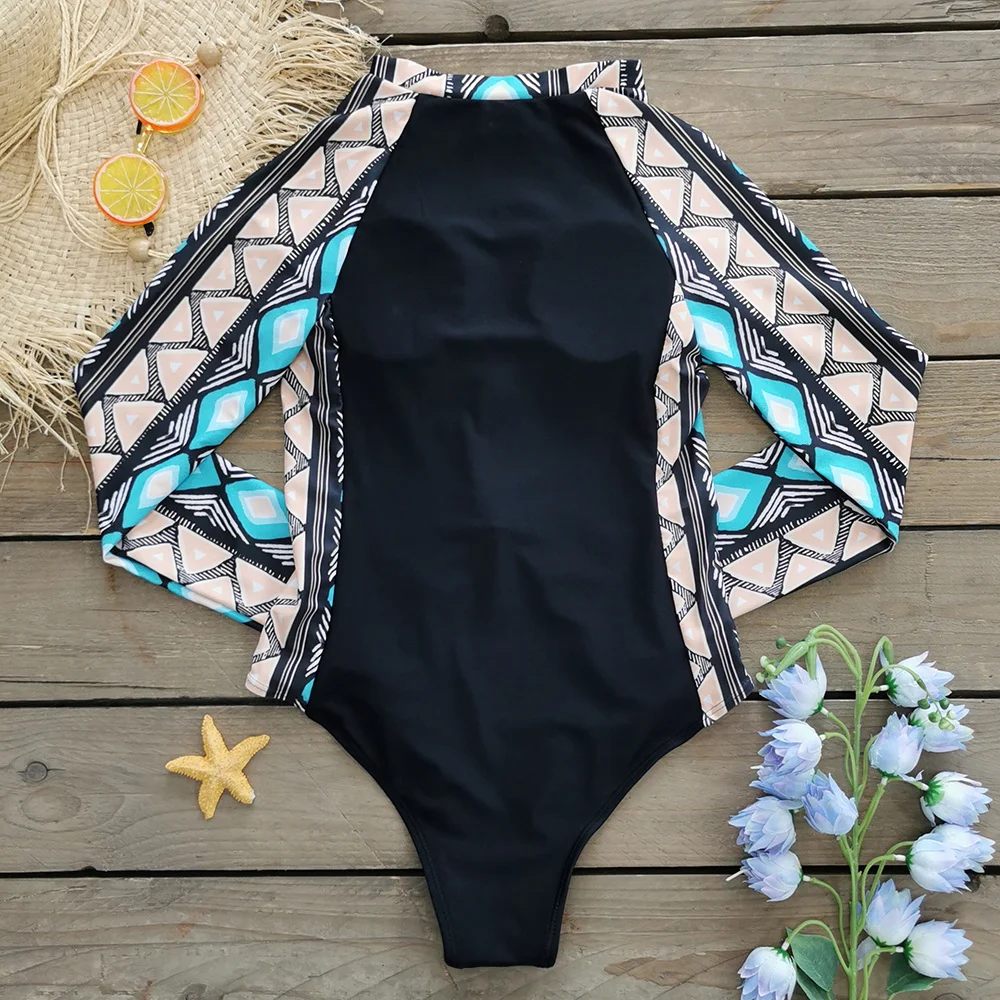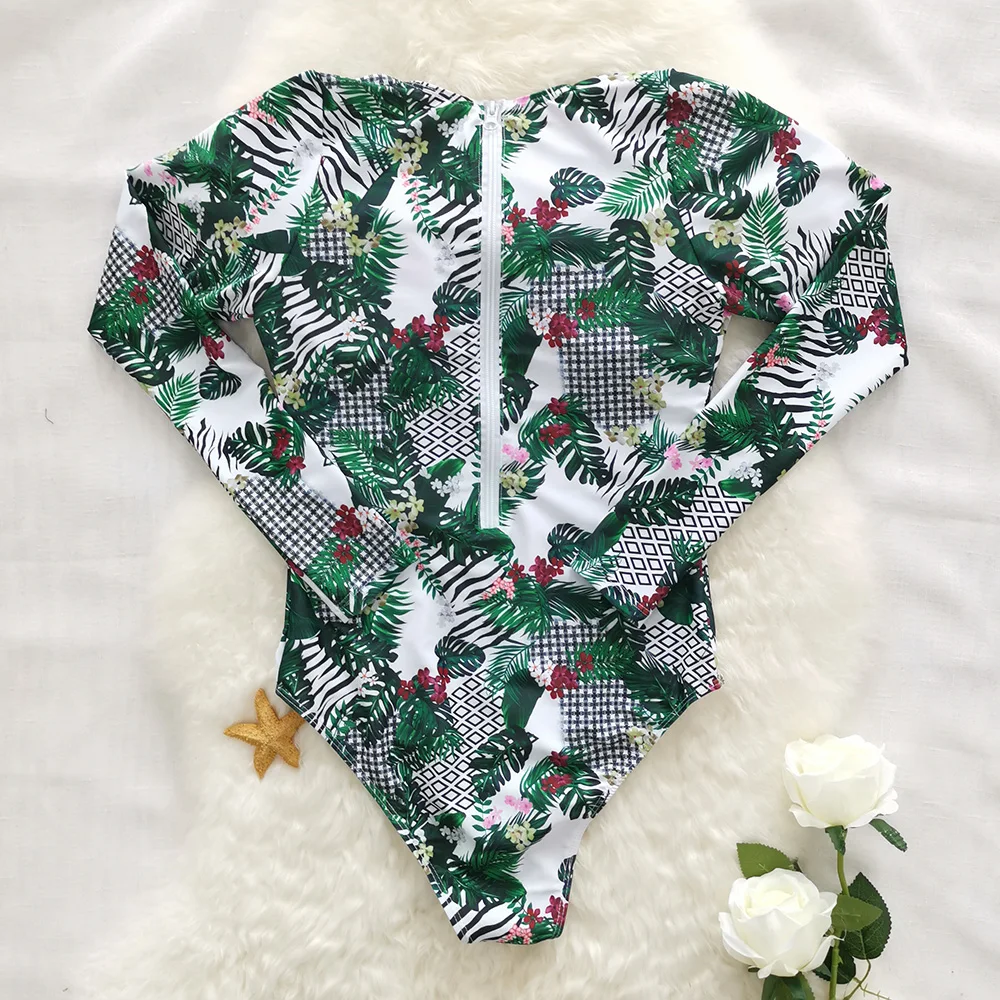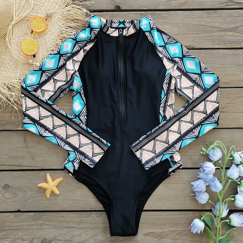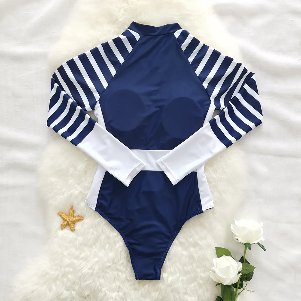 Купальник с длинным рукавом, женский купальный костюм для серфинга, полосатые купальные костюмы, цельный купальный костюм на молнии, Спортивная пляжная одежда с пуш-ап