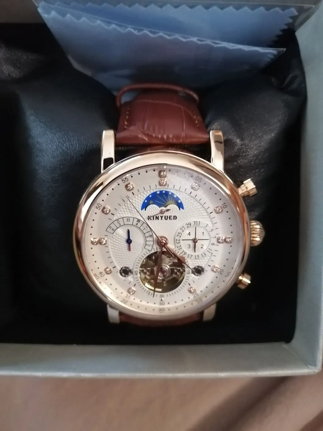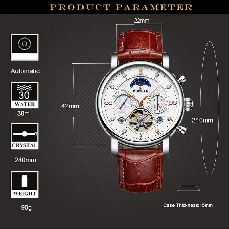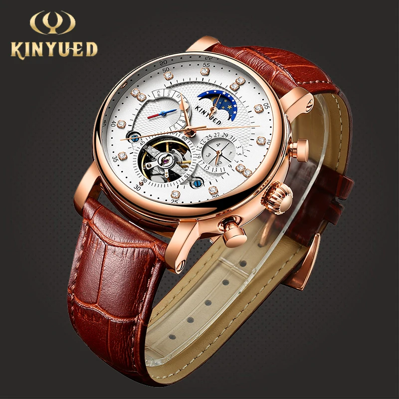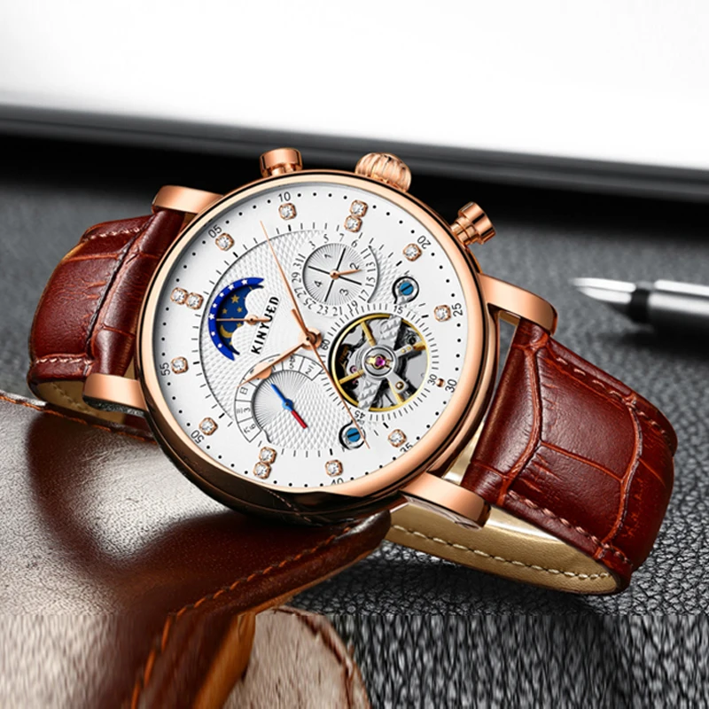 Часы-скелетоны KINYUED Мужские механические, люксовые брендовые автоматические многофункциональные наручные, с календарем, месяцем и фазой