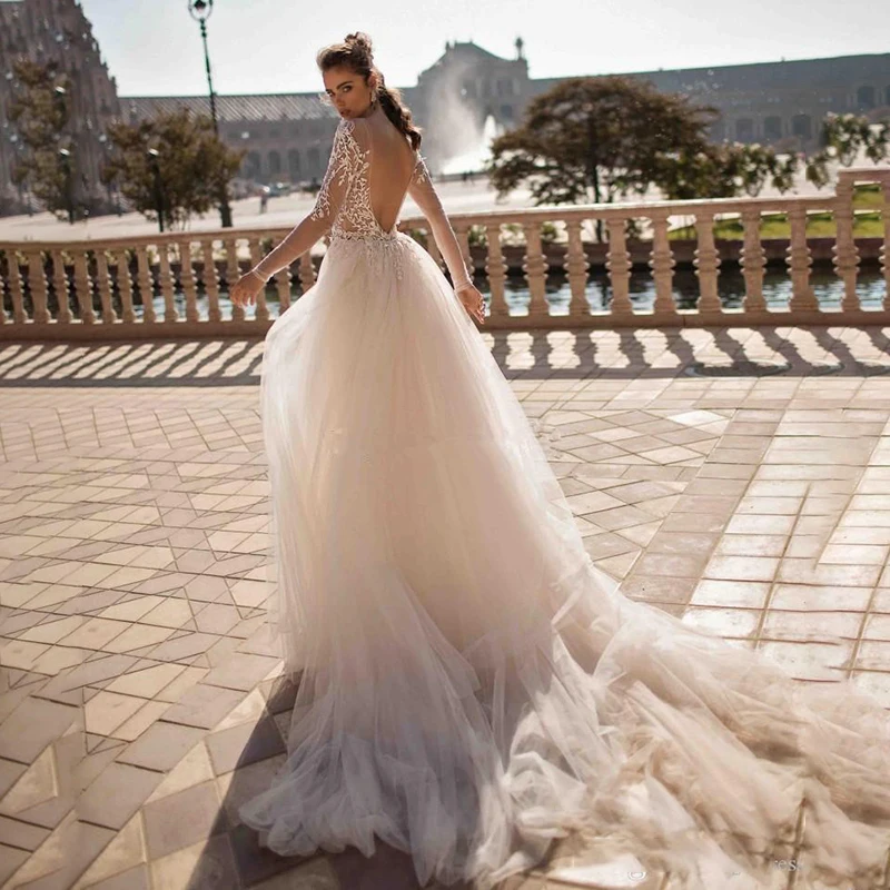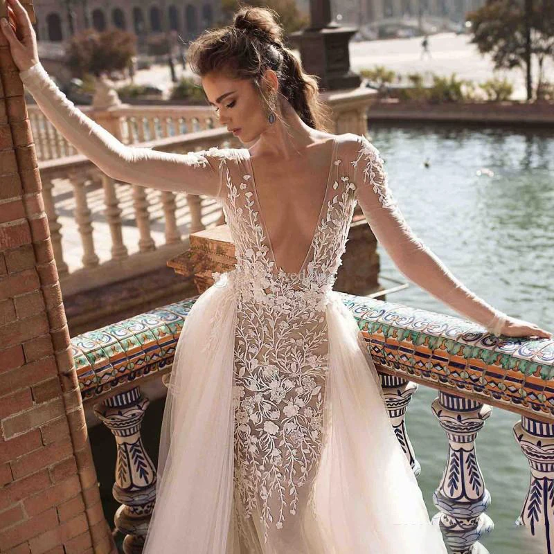 Роскошные свадебные платья русалки с длинным рукавом глубокий v-образный вырез съемный шлейф 2 в 1 Кружевная аппликация на свадебные платья Вышивка Тюль