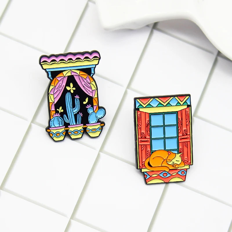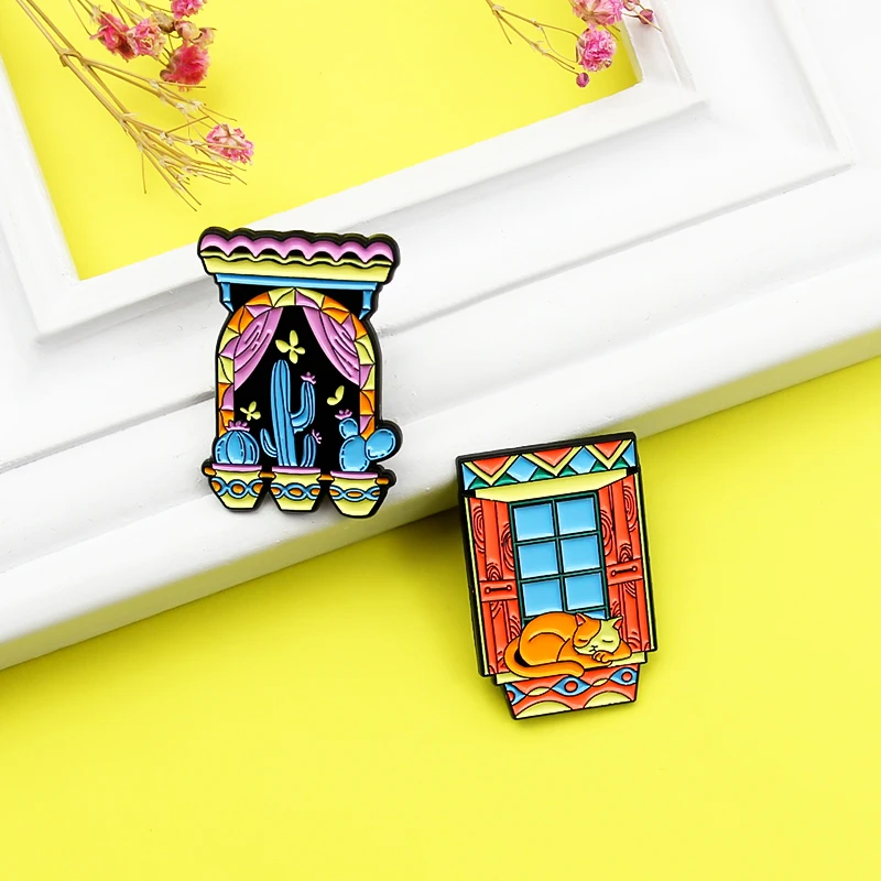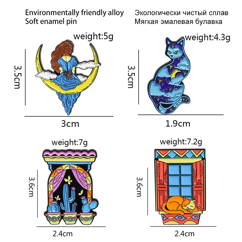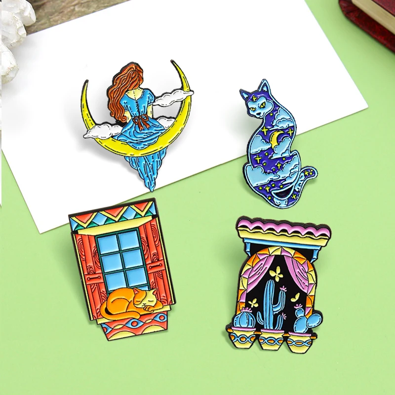 Эмалированный значок на булавке со звездами, небом, кошками, луной, девушками, Луной и звездами, на подоконнике, в горшке, кактус, брошь с растениями, ювелирное украшение в виде лацкана подарок