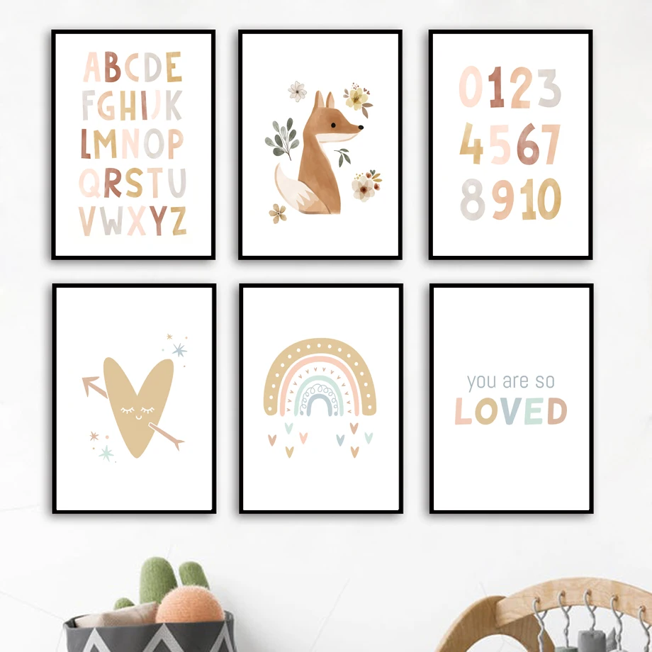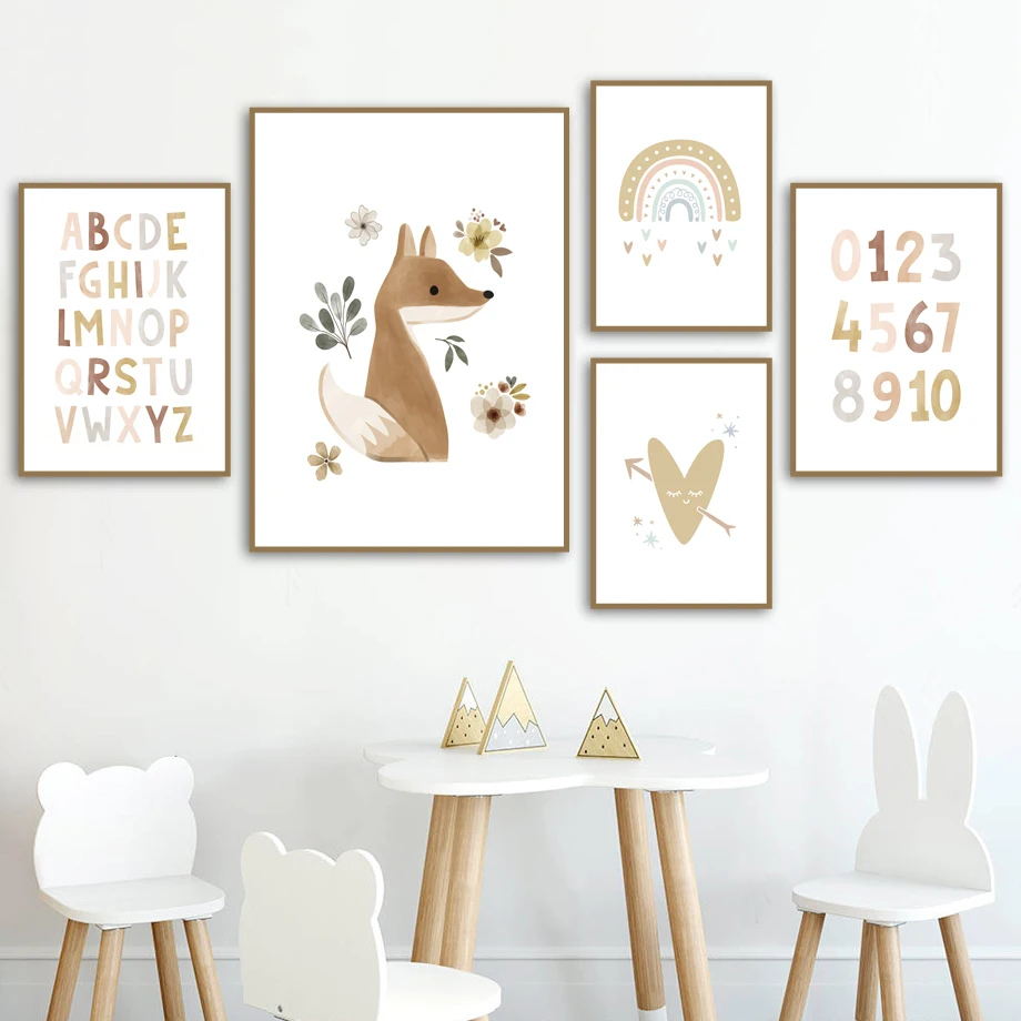 Скандинавский постер Boho ABC Алфавит 123 Радужное сердце Лисичка настенная Художественная печать холст картина настенные картины Детская комната Декор для игровой комнаты