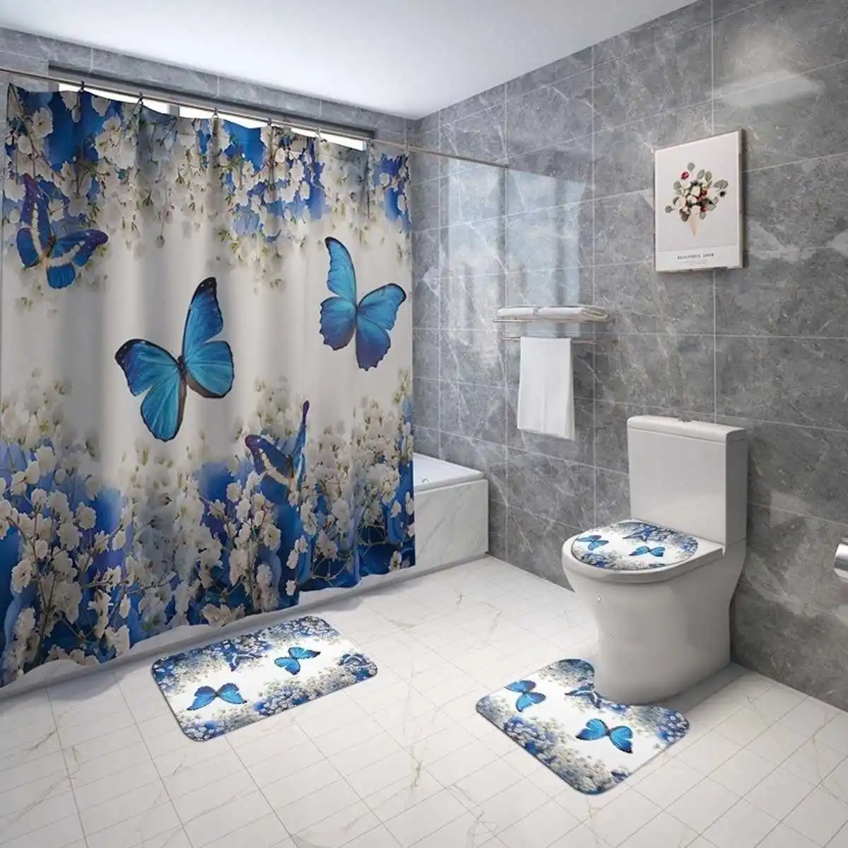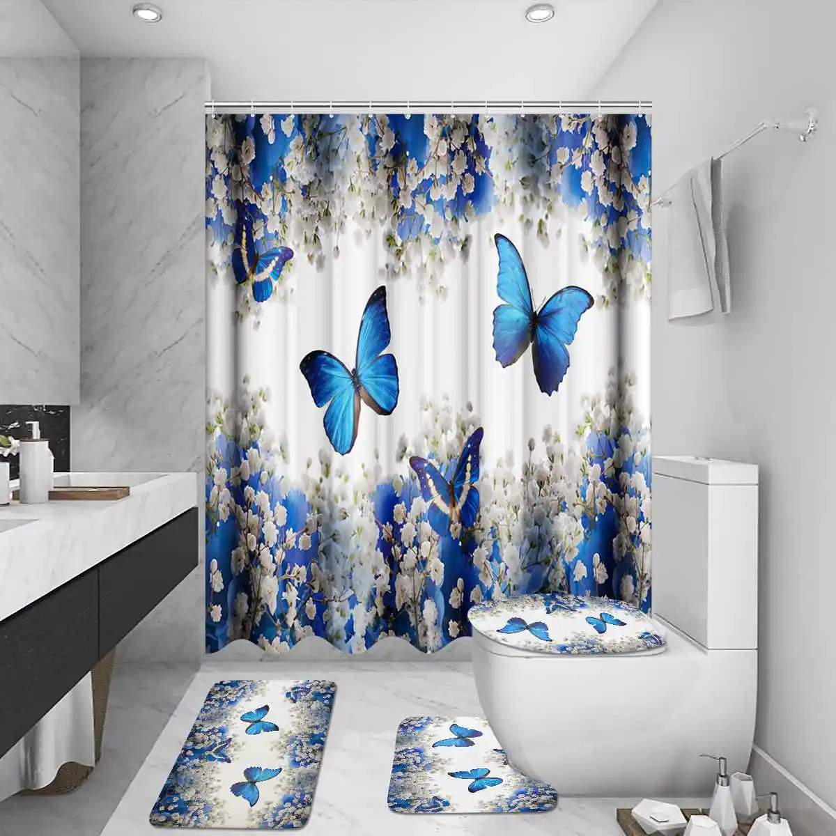 Набор занавесок для душа с синей бабочкой, накидка на ковер, чехол для унитаза, коврик для ванной, занавеска для ванной с 10 крючками, домашний декор