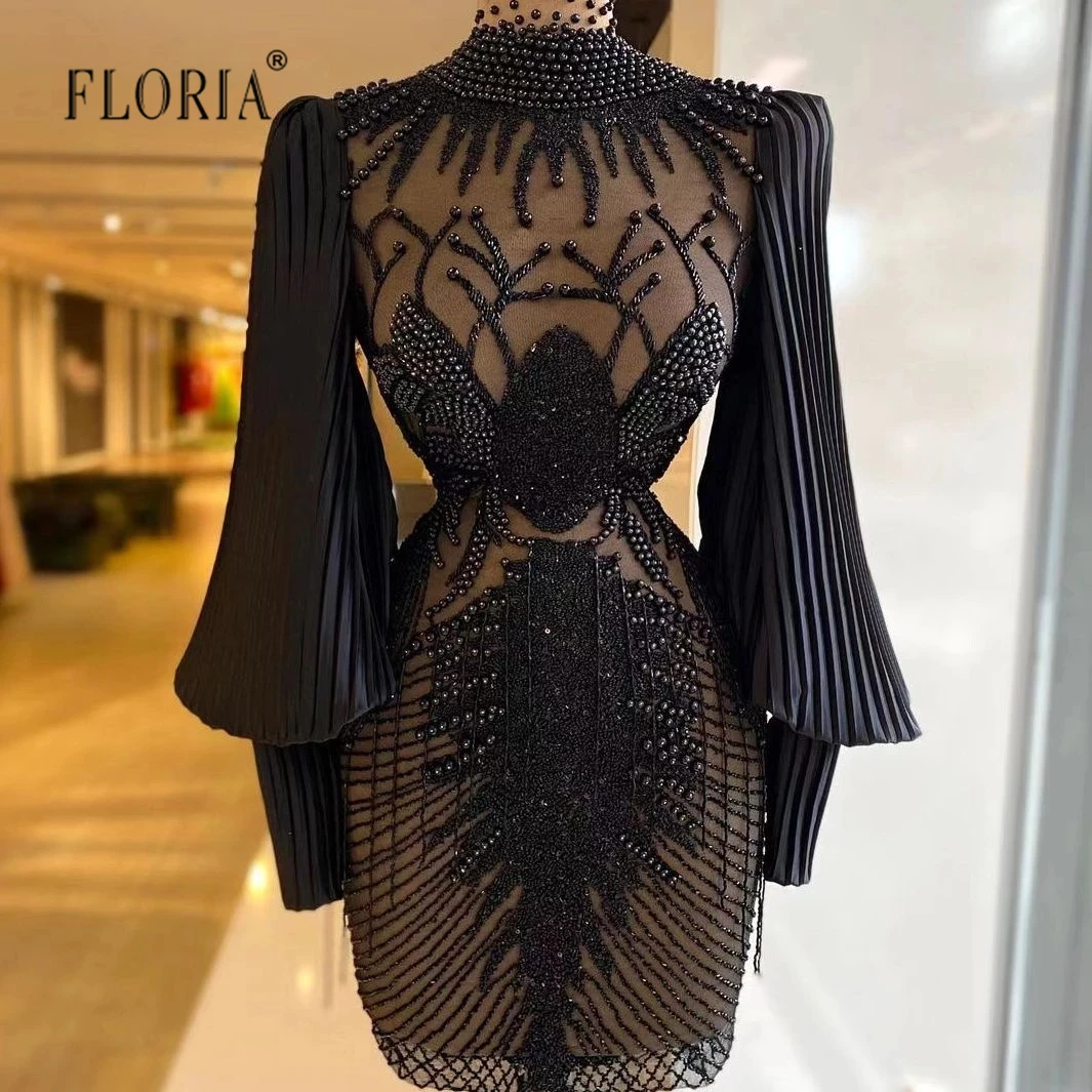 Черное короткое вечернее платье с жемчужинами, длинным рукавом и юбкой годе