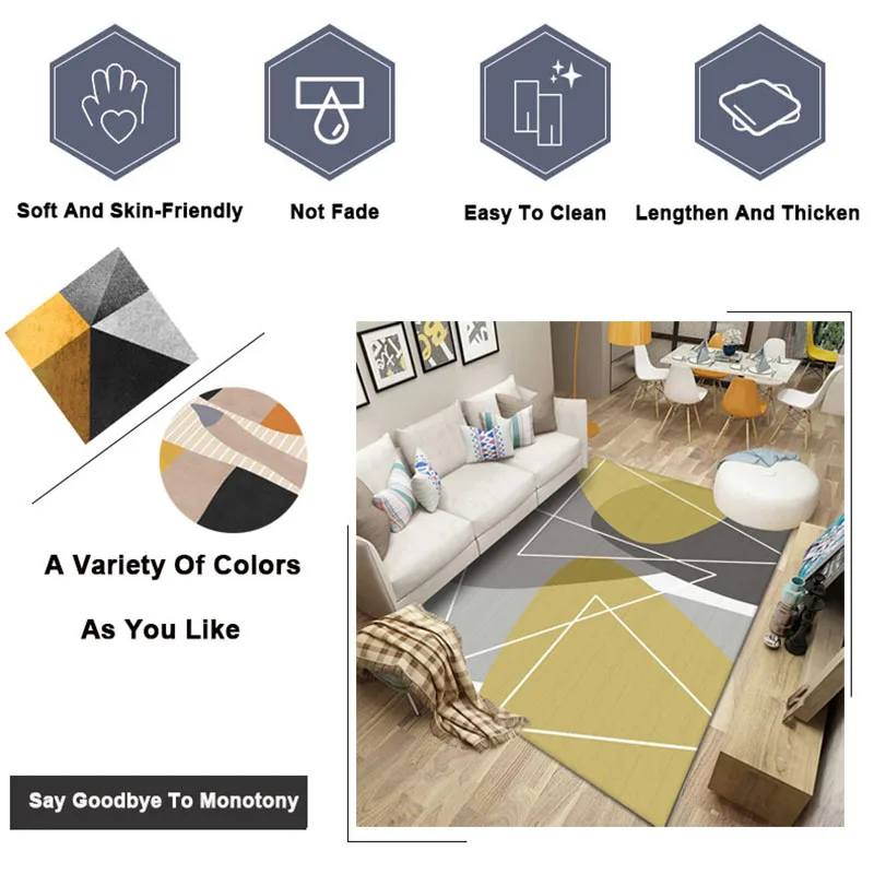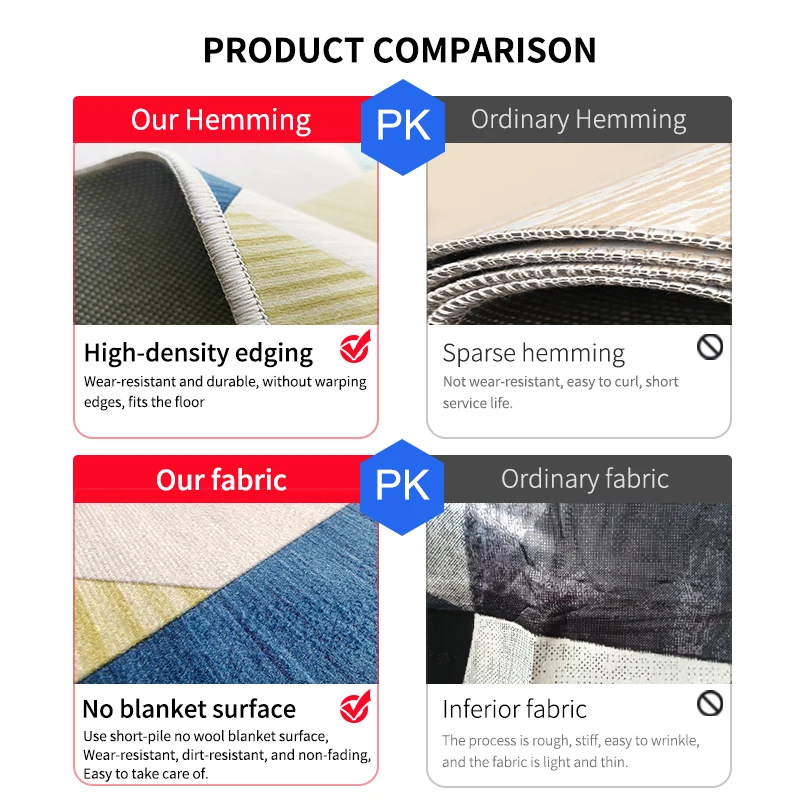 1. Ковровая ткань: ковер изготовлен из трех слоев ткани, напечатанный и окрашенный короткий ворсовый поверхностный слой, Нетканая ткань в среднем слое, нижний слой полностью прилегает к нескользящей подошве.2. Толщина ковра: дизайн трехслойной ткани делает наши ковры толще, чем другие ковры, мягкие и нескользящие, длительный срок службы, и не легко деформируется.3. Ковер не имеет специфического запаха: 0 формальдегид, безопасный и без специфического запаха, мягкая ткань ковра используется для детей, чтобы играть на ковре.4. Легко ухаживать: короткий ворс делает наши ковры легко ухаживать, и пыль не легко застревать на ворсе. Его нужно только регулярно пылесосить или очистить.5. Качество ковров: наши ковры имеют лучшее качество, чем обычные ковры, с толстой толщины, хорошая ткань, мягкая и приятная для кожи, легко ухаживать, нулевой формальдегид, нет специфического запаха, никакого вреда для человеческого тела, и ковры высокого качества имеют более длительный срок службы!