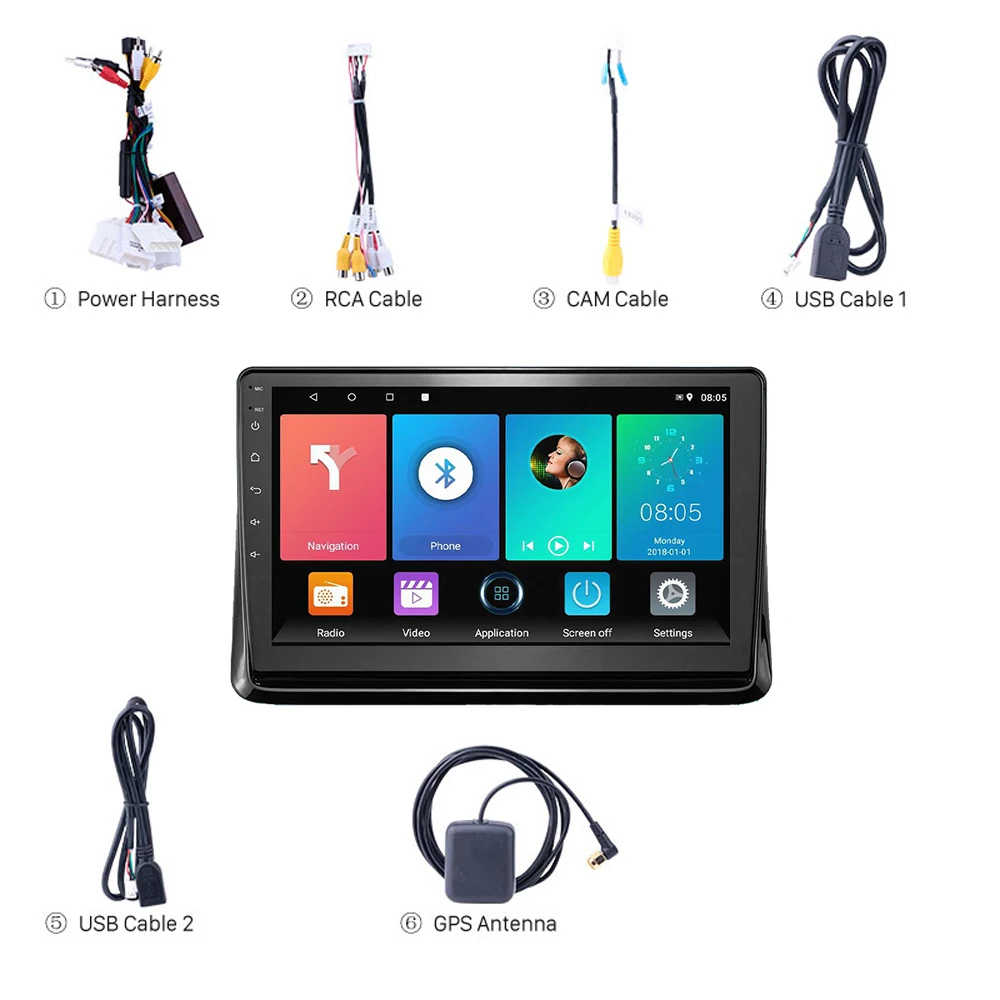 1 Автомобильный MP5 плеер1 x Кабель Питания1 Антенна GPS1 вход для камеры1 вход и выход RCA2 x USB-кабеля1 x Инструкция по эксплуатации