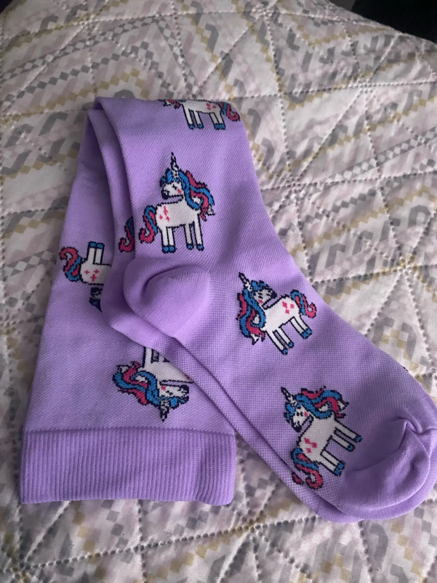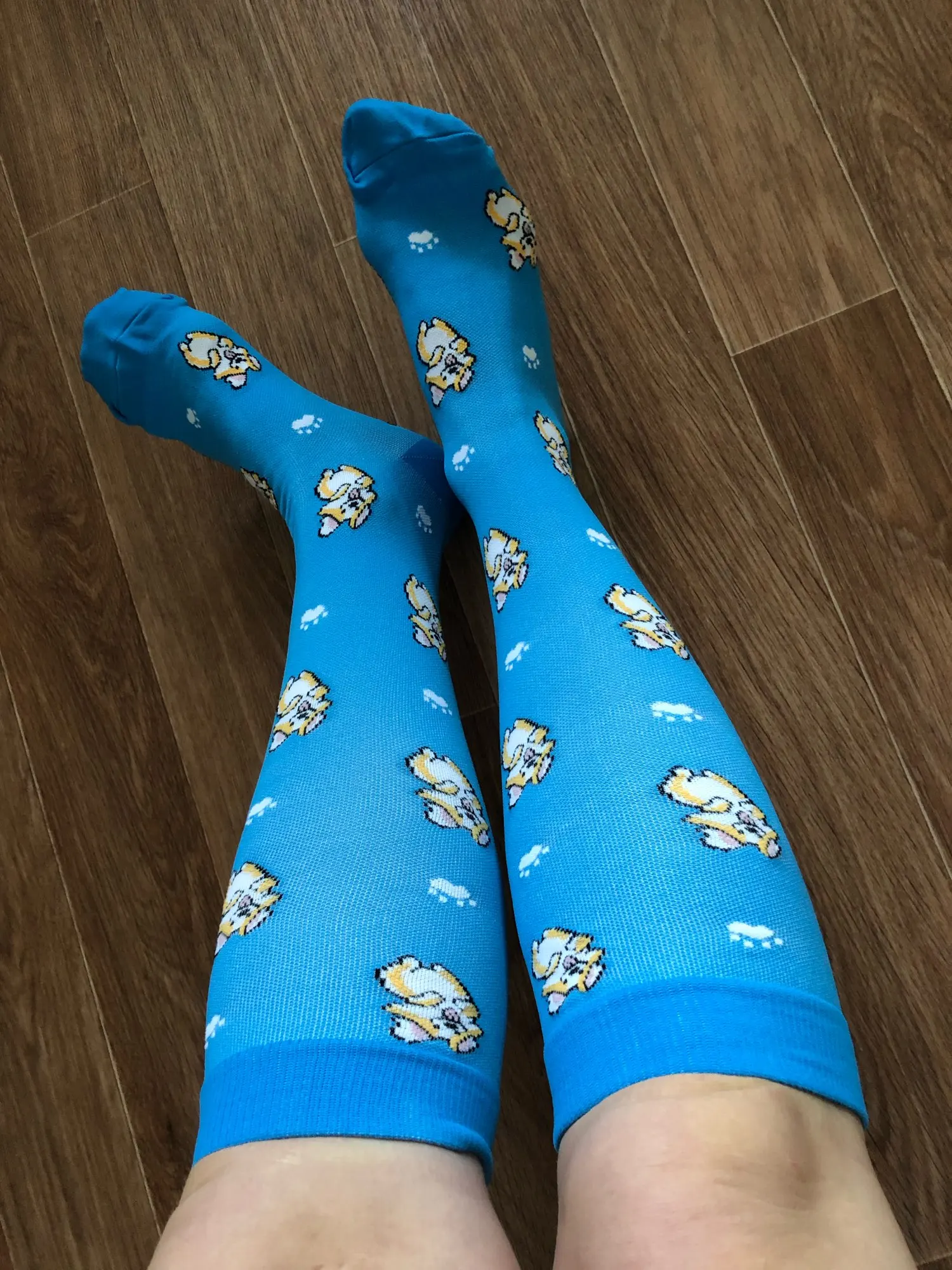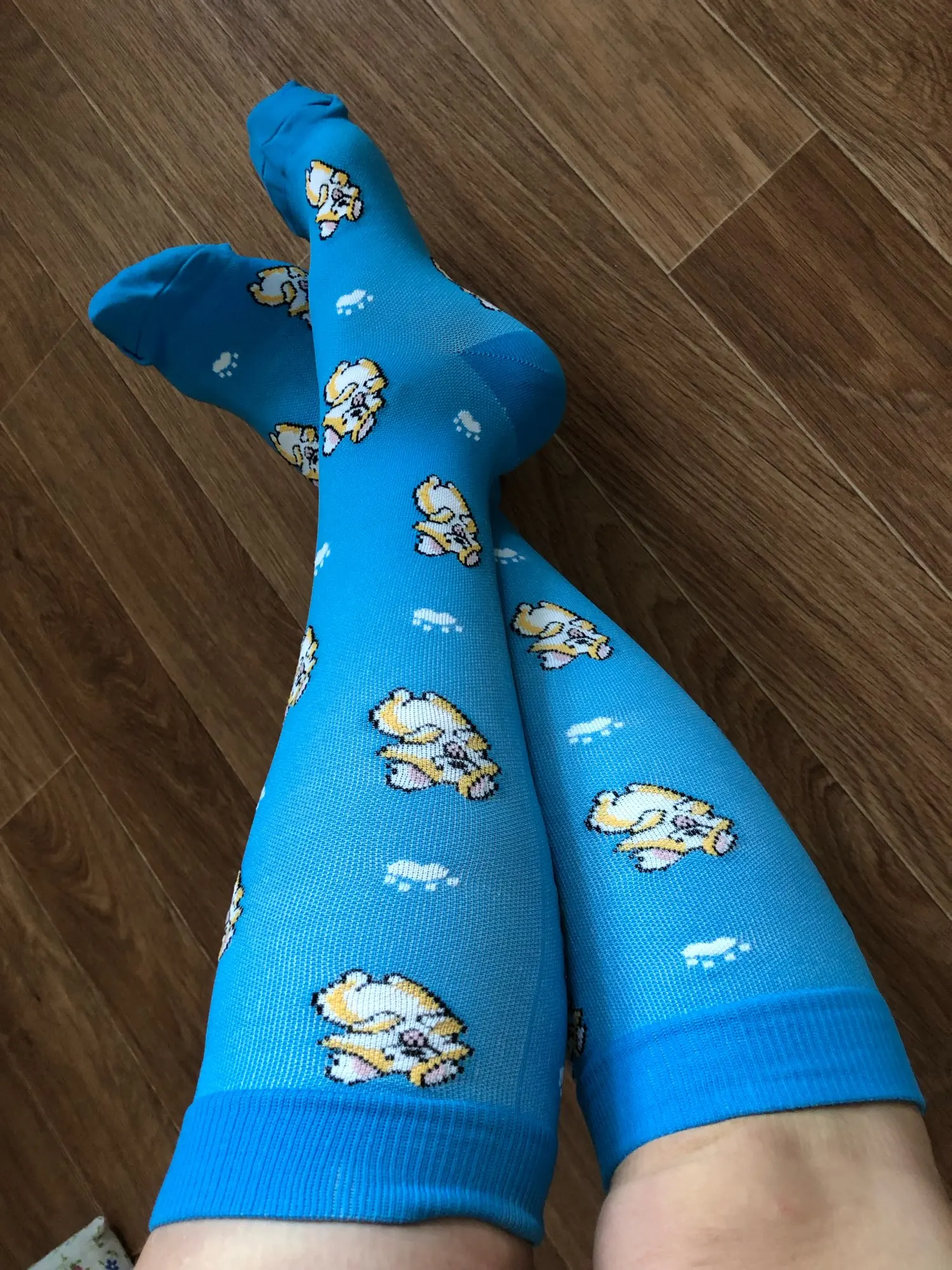 Пёсики прикольные. Неожиданно яркие. Голубой как цвет детского фломастера, очень насыщенный. На рост 163 см эта пара ровно до колена - мне комфортно. В других расцветках выше - до середины колена - не очень мне удобная длина. Компрессионный эффект ощущается. Усиленные пятка и мысок. На российский 38 (длина стопы 24,5 см) размер как раз. Хорошие, качество и внешний вид без нареканий. Приехали в постомат в Москву чуть раньше заявленного срока.