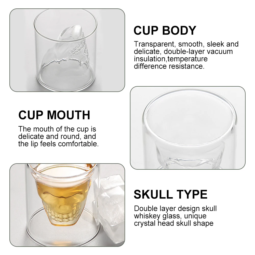 Двухслойное стекло для виски с черепом, уникальная форма черепа с кристаллами, внутренняя стенка и дно разделены, так что все виды красивых жидкостей подвешиваются на воздухе, создавая визуальную иллюзию, дарит людям чудесное чувство удивления и высокого качества.