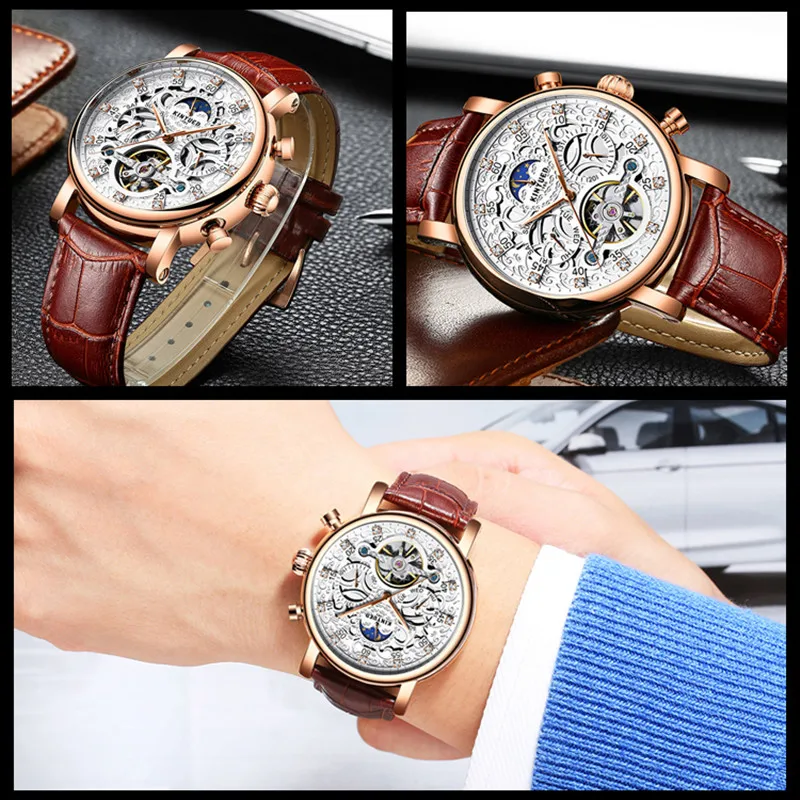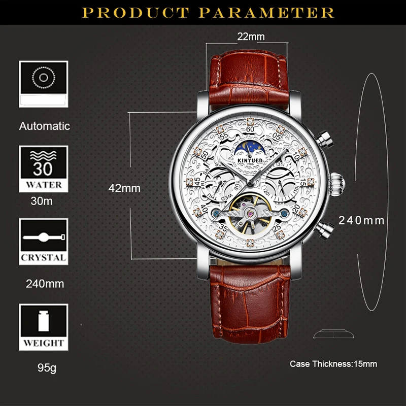 Часы наручные KINYUED Мужские механические, автоматические водонепроницаемые деловые с солнечной и лунной фазой