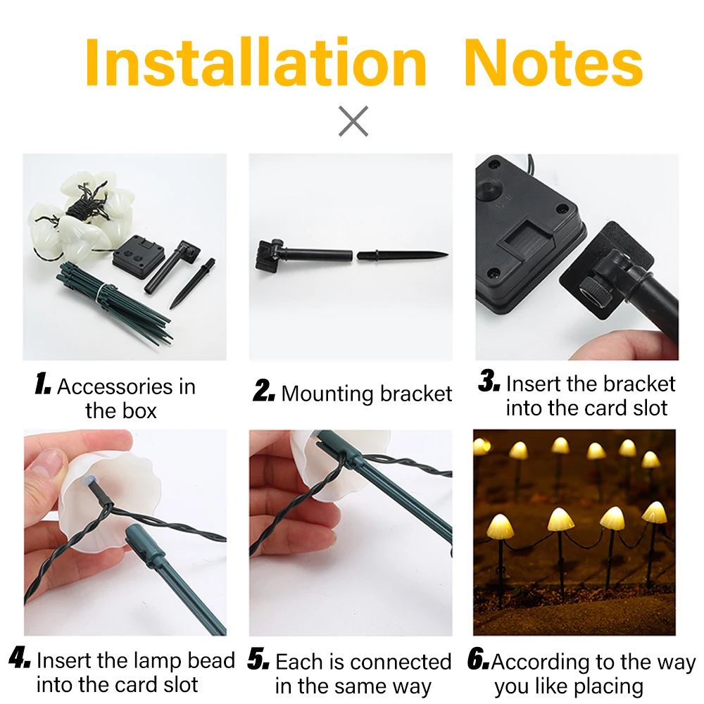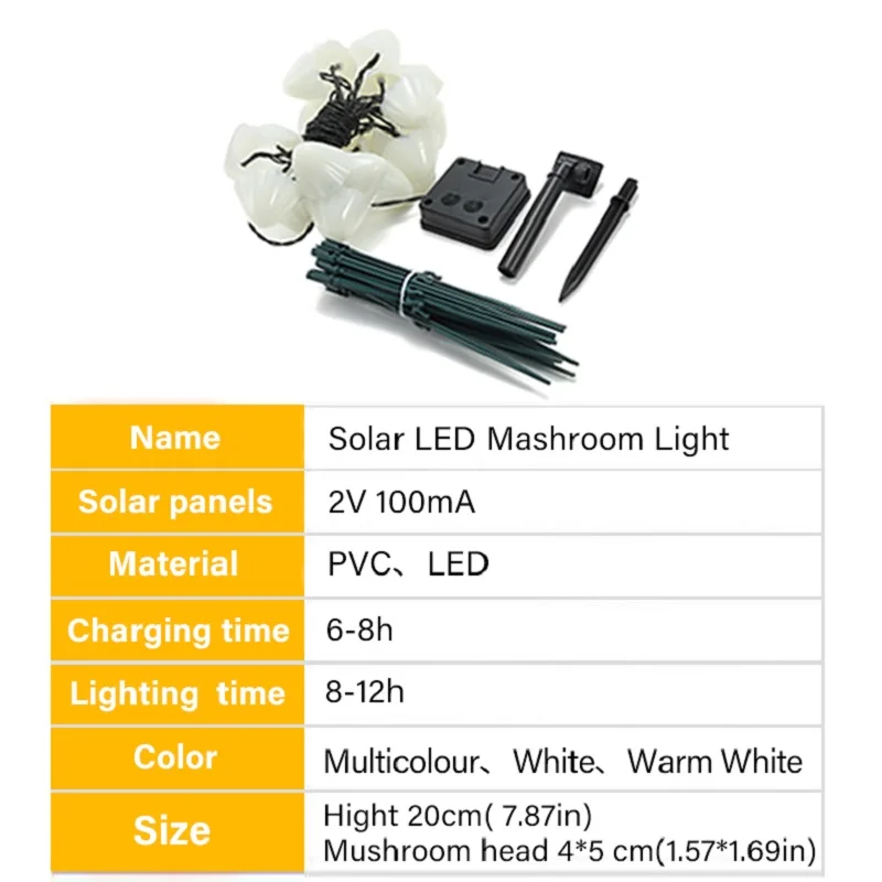 Гирлянда на солнечной батарее x1Кронштейн (для грибных огней) x1Солнечная панель x1Наземный кол (для солнечной панели) x1