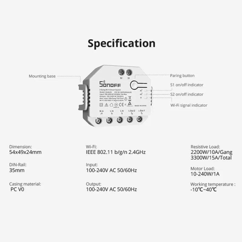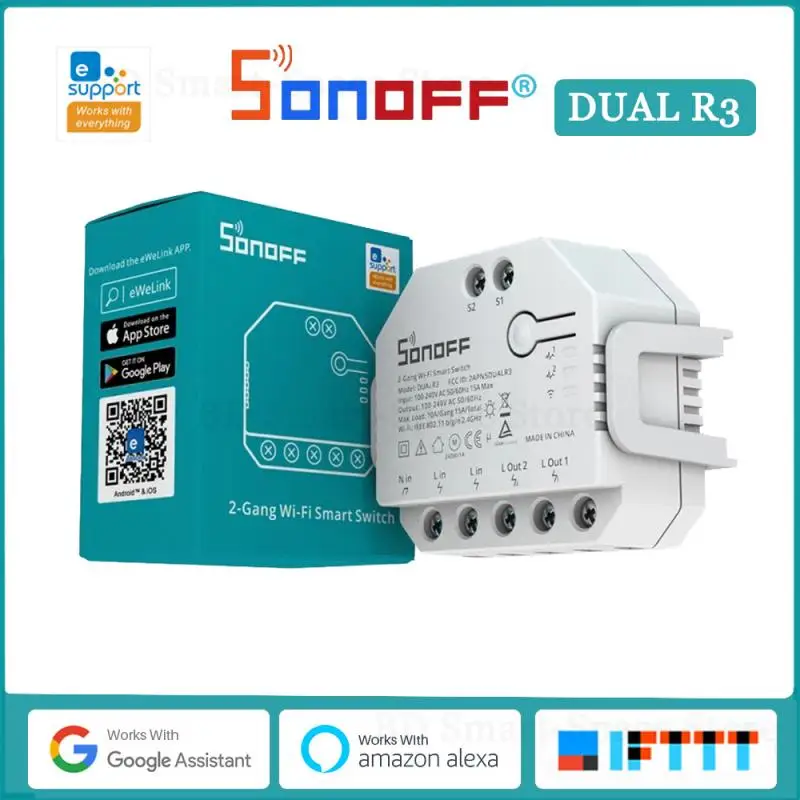 SONOFF DUALR3 выводит ваш дом на следующий уровень. DUALR3-это встроенный модуль беспроводного двойного реле Wi-Fi, который устанавливается за любым стандартным переключателем для передачи его в умный переключатель для беспроводного дистанционного управления с помощью мобильных устройств или голосовой команды. Объединяя ваши бытовые приборы в интегрированную беспроводную сеть, чтобы они общались друг с другом, что удобно для вас управлять и контролировать, включая свет, бытовую технику и моторизованный
