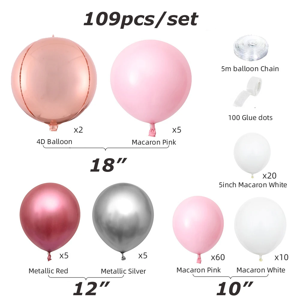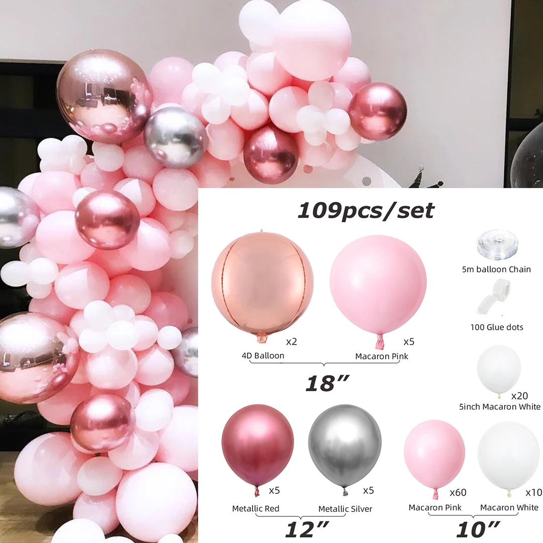 109 шт./компл.2 шт. 18 дюймов 4D шар цвета розового золота5 шт. 18 дюймов светлый цвет, розовый5 шт. 12 дюймов красный металлик5 шт 12 дюймов металлическое серебро60 шт 10 дюймов Макарон розовый10 шт 10 дюймов Макарон белый20 шт 5 дюймов Макарон белый1 шт. цепочка для воздушных шаров1 шт. клеевая точка