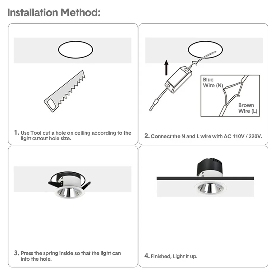 Вход: AC85-265VМатериал корпуса: высококачественный алюминийБыстрое рассеивание тепла.Продолжительная работа.Мощность: 7 Вт 12 Вт 15 ВтСветодиодный светильник источник: COB светодиодный чипЛюмены (лм): 100-110 лм/ВтУгол луча: 25 °-30 °Индекс цветопередачи: Ra >90Светильник Цвет: холодный белый (6000-6500K)Теплый белый (3000-3500K)Натуральный белый (4000-4500K)