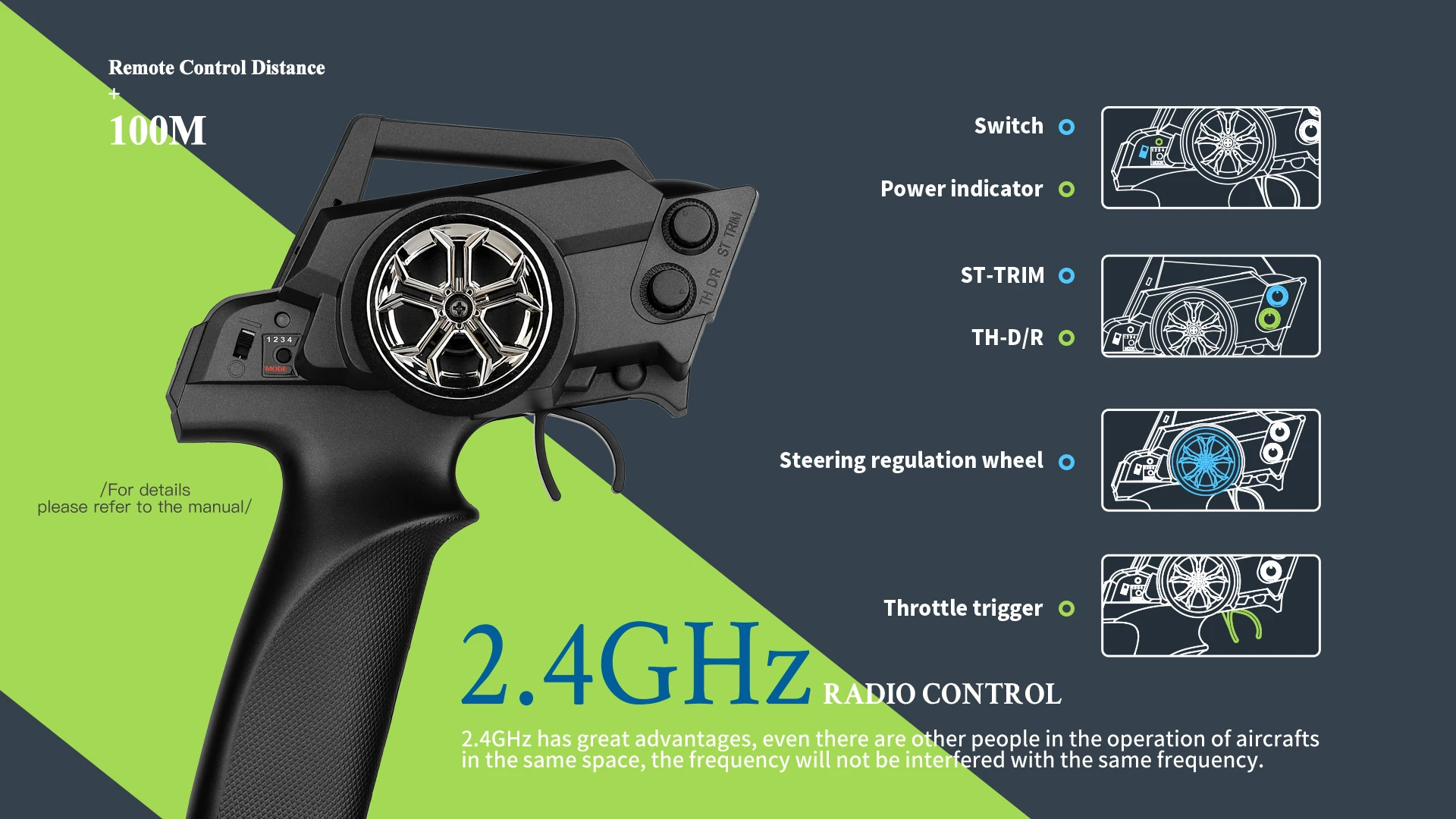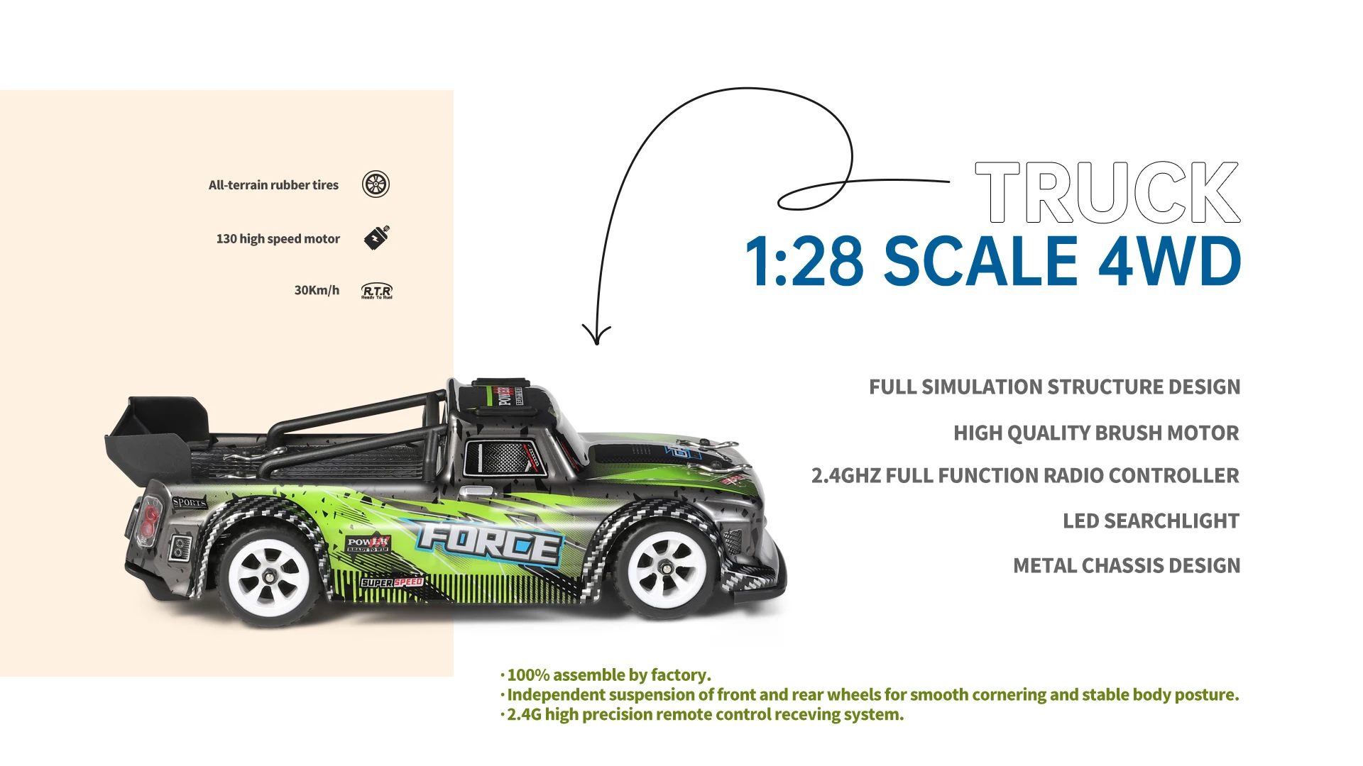 Вездеходные резиновые шины с сильной адгезией и сопротивлением трению. Независимая подвеска передних и задних колес для плавного поворота и стабильного тела. 2.4g высокоточная система дистанционного управления.
