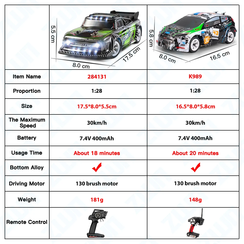 Название продукта: автомобиль с дистанционным управлениемБренд: WltoysСоотношение: 1/28Основной материал: алюминиевый сплав, пластикМаксимальная скорость: 30 км/чДополнительная Батарея: 1 версия батареиЧастота: 2,4GАккумулятор: 7,4 В 400 мАчДвигатель: 130 матовый двигательВремя зарядки: 63 минутыВремя работы: 18 минутРасстояние дистанционного управления: более 100 метровБатарея дистанционного управления: 4 батарейки типа АА (не входят в комплект)Продукт Размеры: 17,5*8*5,5 см