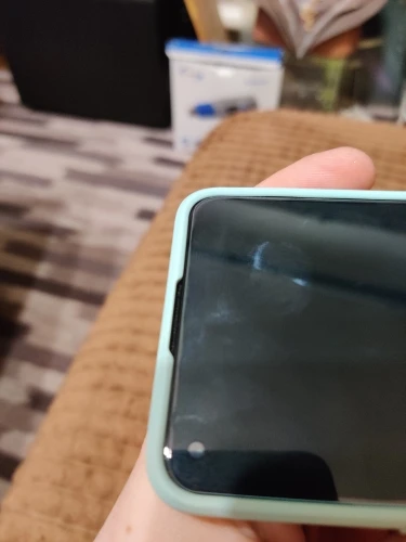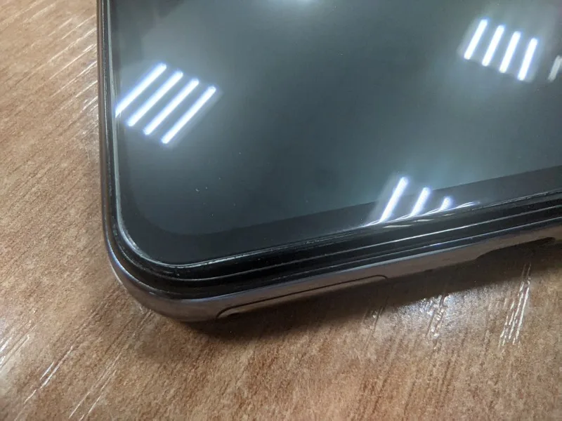 Закаленное стекло просто немного слишком большое, 0,5 мм или так на каждой стороне, поэтому вокруг экрана образуется воздушный пузырь. Работает просто хорошо, только раздражает зрительно.