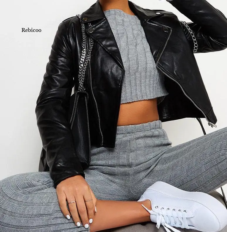 Женская кожаная куртка из ПУ кожи, короткая приталенная мотоциклетн...