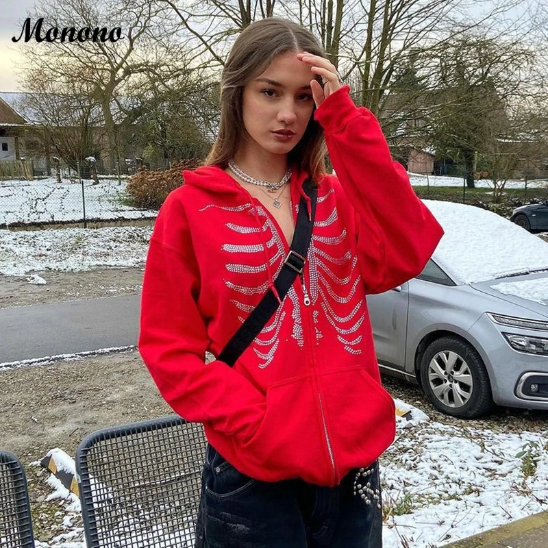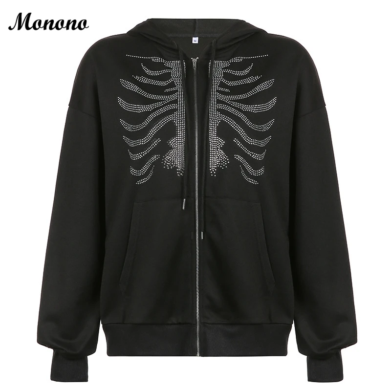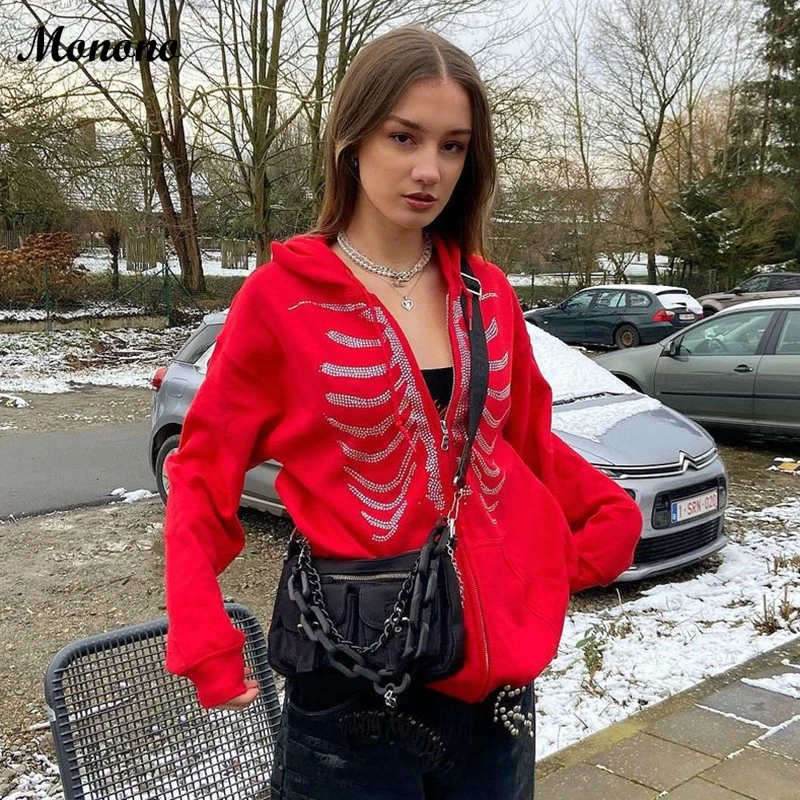 Y2K Стразы худи скелет Женская Осенняя уличная одежда на молнии гот...