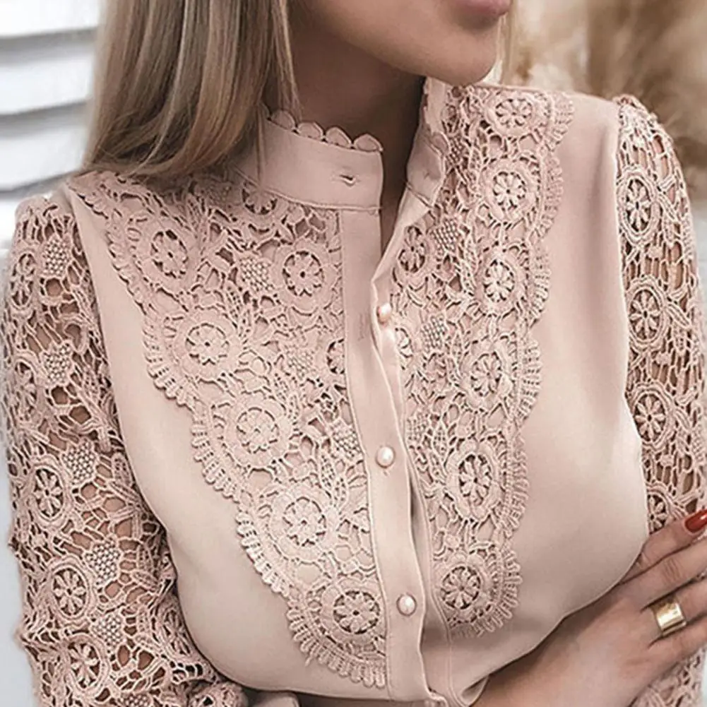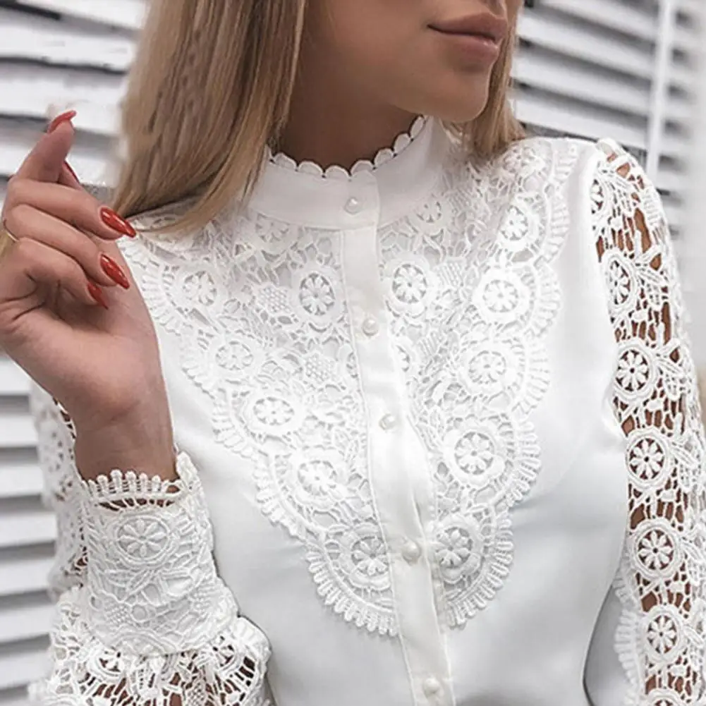 Женская офисная блузка на пуговицах, кружевная рубашка с цветочной вышивкой и воротником-стойкой, ажурный топ в стиле пэчворк с длинным рукавом, весна-осень