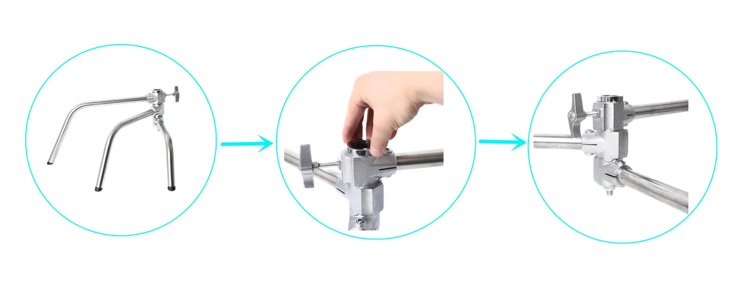 ЭтоИмеет Стандартное основание и 3 складные ножки с уникальными креплениями, которыеЛегко складывается. Максимальная высота составляет 130 дюймов. Расширение 50 дюймовРуку и 2,5 дюйма зажимной головкой. Хромовая сталь металлический сплав для любой погодыУсловий.