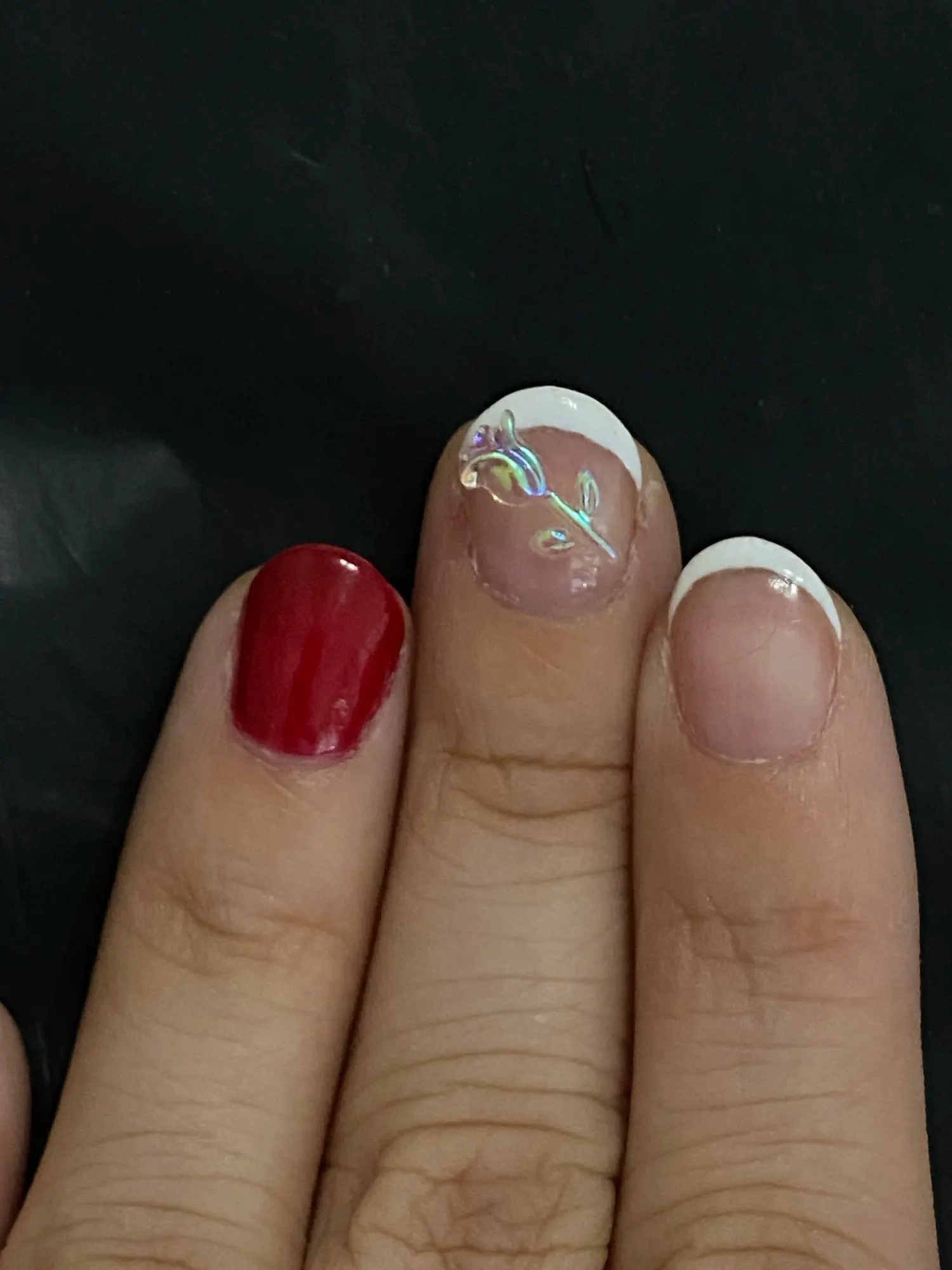 Очистите поверхность ваших ногтей, нанесите Базовый лак, нанесите понравившуюся вам форму на ногти