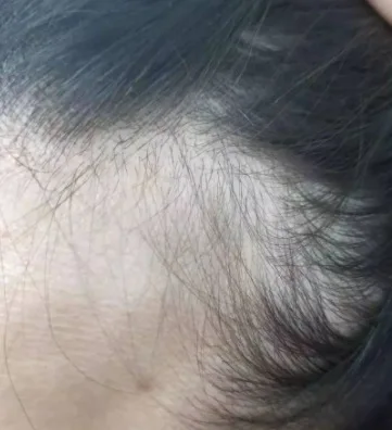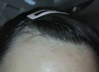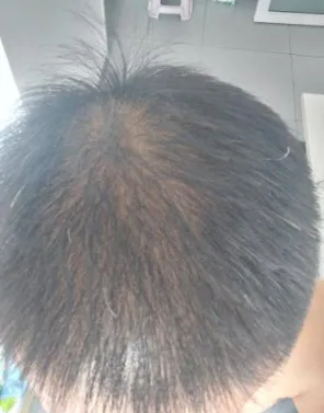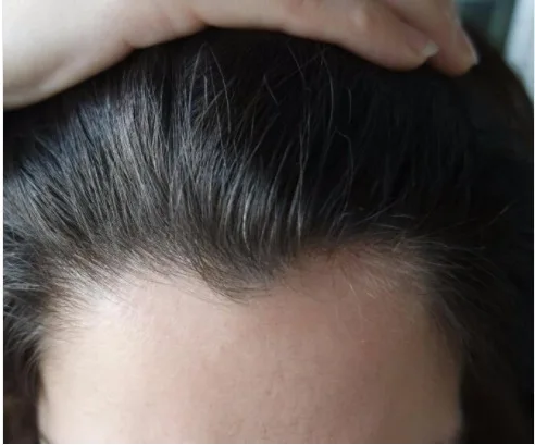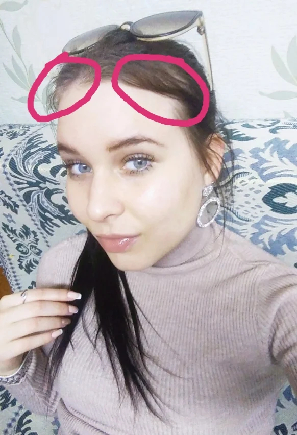 Много положительных отзывов, взяла попробовать один тюбик, чтобы восполнить густоту волос в районе височной части головы. Приобрела два продукта этой фирмы:масло с дозатором 20ml(фото 2) и масло в тюбике тоже 20ml. Буду пробовать их в тандеме. Фото до закрепляю(на фото выделены зоны облысения)