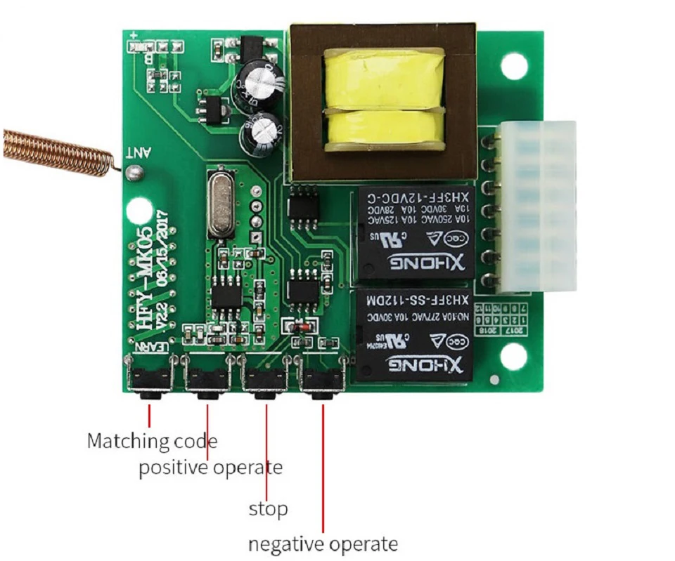 ◆Сопряжение новых ремней: Нажмите кнопку обучения, индикатор сигнала светильник s выключается, затем нажмите любую кнопку на пульте дистанционного управления. Сигнальный светильник fashes затем выключается, чтобы указать, что добавлен успешно.◆Ликвидация: Длительное нажатие кнопки learn-key не отпускает, индикатор питания от выключения переходит в мигание ситуации, указывая, что четкий код успешен.◆Настройка двигателя вперед/назад: Нажмите кнопку блокировки пульта дистанционного управления до тех пор, пока индикатор питания не выключится, начнет мигать, а затем отпустите кнопку дистанционного управления; что указывает на то, что рабочее направление двигателя успешно изменено.