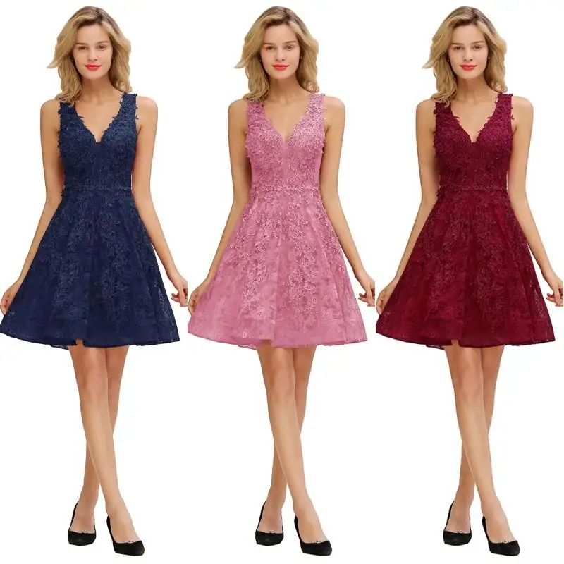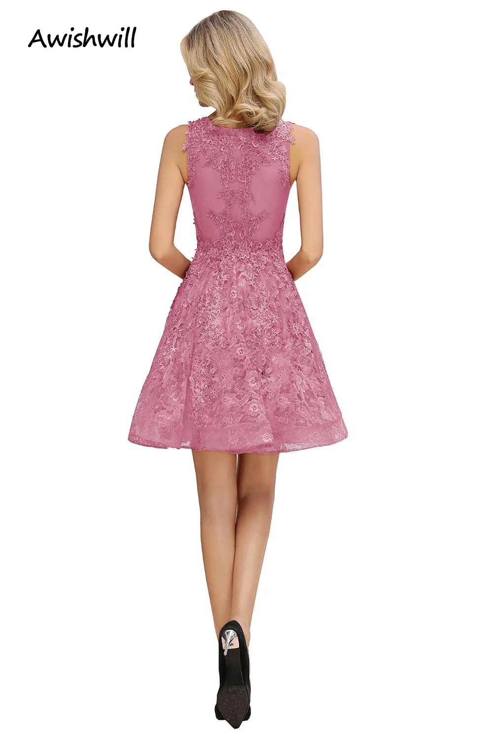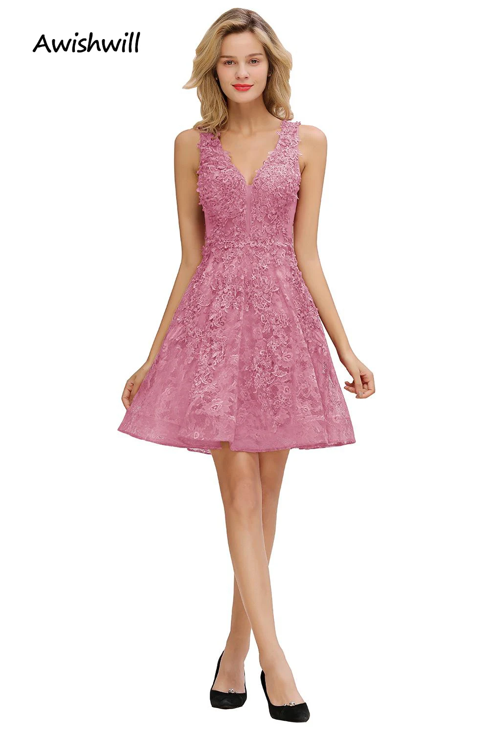 Сексуальные короткие кружевные платья с V-образным вырезом для встречи выпускников розовые платья без рукавов для выпускного вечера