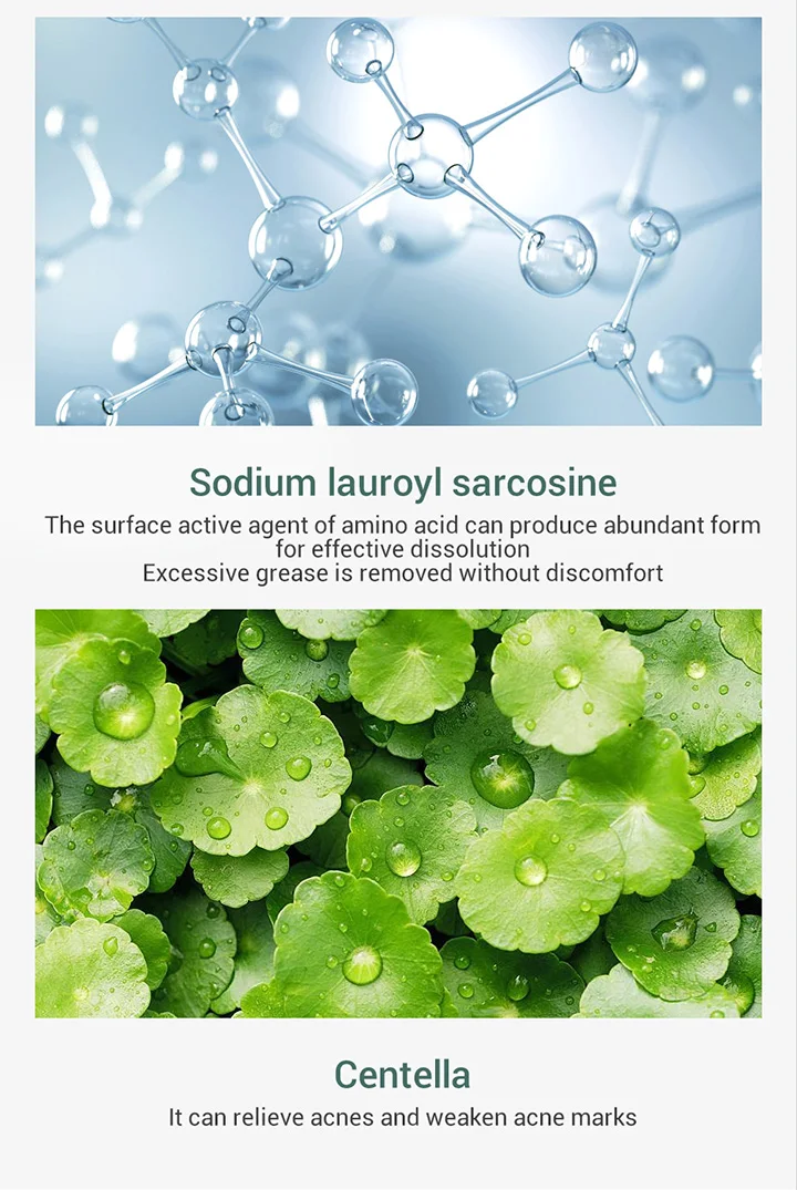 Поверхностный активный агент аминокислоты может производить обильную форму для эффективного растворенияЧрезмерная смазка удаляется без дискомфортаЦентеллаЭто может облегчить acnesИ ослабляет следы акне