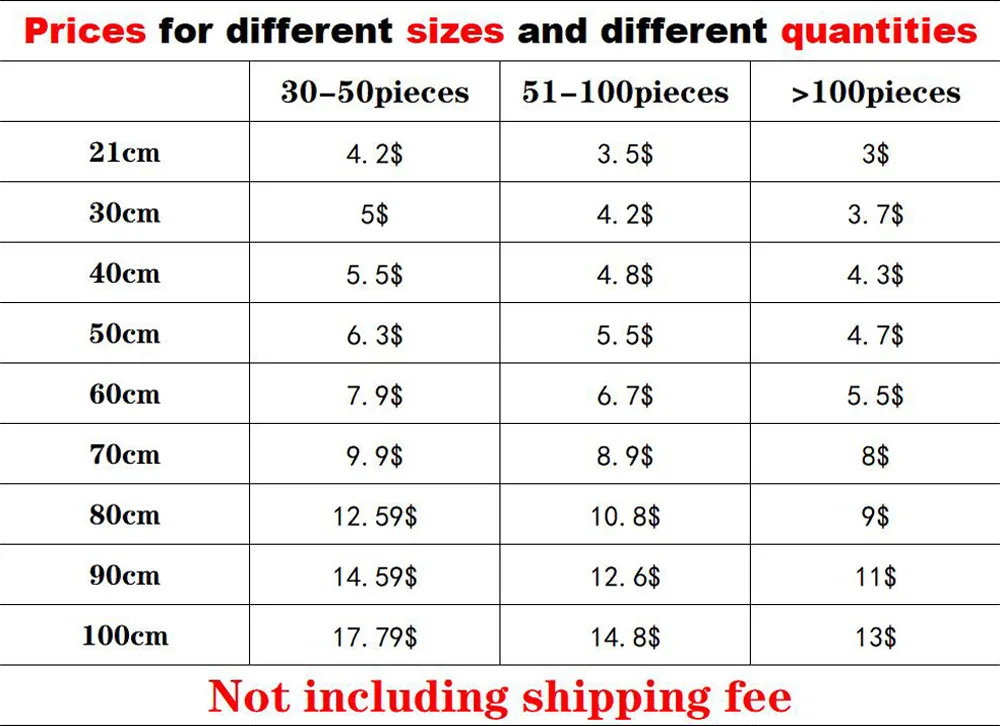 Мы начали наш оптовый бизнес по закупкам, и приветствуем клиентов, которые нуждаются в запросе о наших продуктах. Цены в таблице ниже соответствуют разным размерам и количествам, которые не включают транспортные расходы. Для оптовых заказов мы можем использовать льготные морские перевозки или перевозки поездом, и цена ниже. Если требования к времени относительно высоки, у нас также есть услуги по воздушным перевозкам. При условии, добро пожаловать на консультацию.