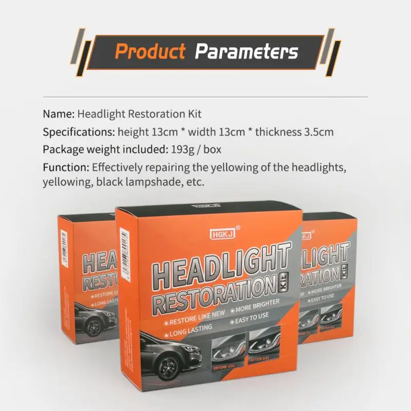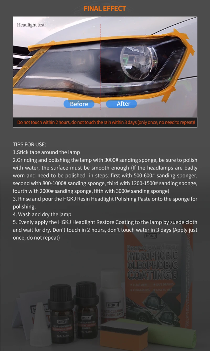 5. Равномерно распределите покрытие фар HGKJ на лампе губкой или замшевой тканью. Оставьте его сухим и не прикасайтесь к нему в течение 2 часов. Не прикасайтесь к дождю в течение 3 дней (применяется только один раз, не повторяйте)