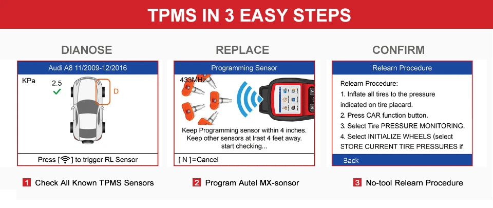 Программирование датчика TPMS может и будет работать только с Autel MX-sensor. Доступно 4 варианта для завершения программирования mx-сенсоров, и каждый из них имеет свои преимущества и характеристики:Автоматическое создание-Применение случайного идентификатора для проверенного транспортного средстваРучное Создание-вручную введите случайный ID или оригинальный ID датчикаКопируйте с помощью OBD - read ID датчика с функцией Relearn и записывайте его на MX-sensorКопировать при активации-автоматически записывать в полученном исходном датчике данные в MX-sensor в случае срабатывания оригинального датчика