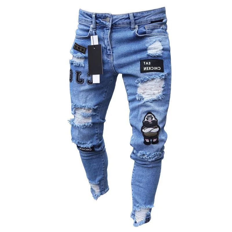Мужские джинсы с вышивкой и мультяшным принтом, эластичные рваные о...