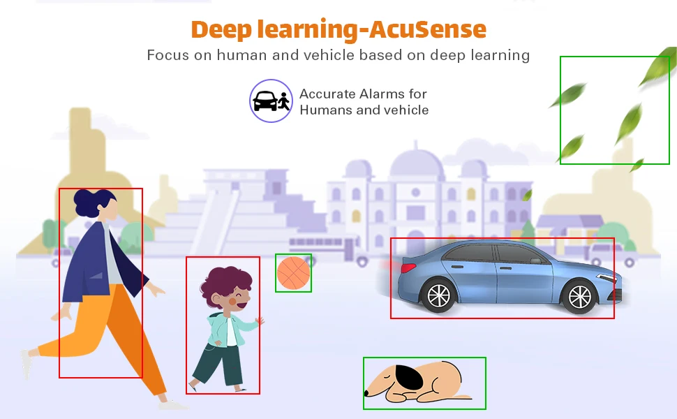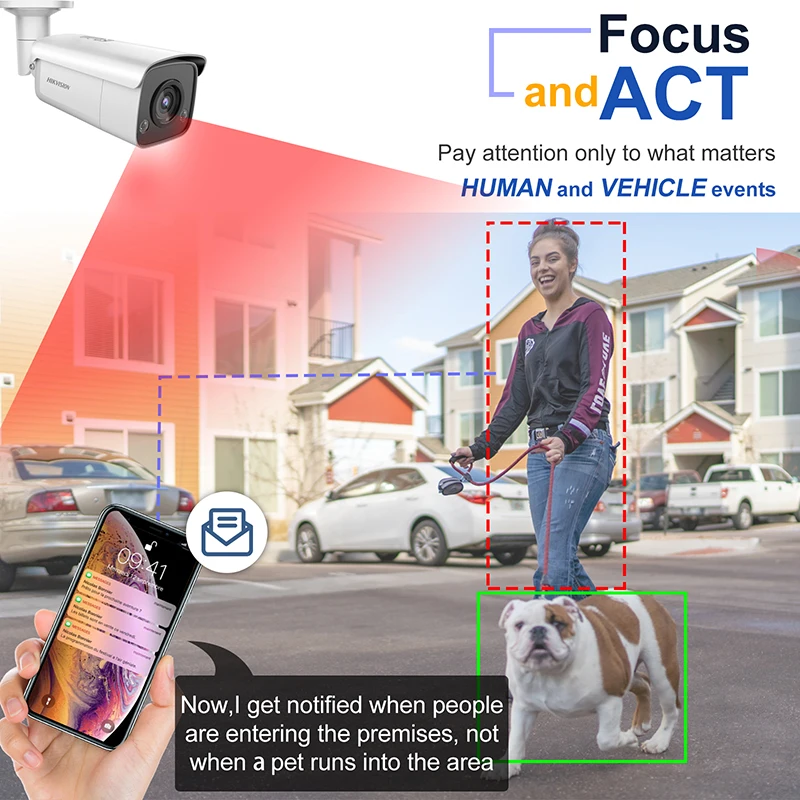Технология Hikvision AcuSense обеспечивает точное определение аппаратных средств безопасности. Обладая глубокими алгоритмами обучения, технология AcuSense отличает людей и транспортные средства от других движущихся объектов.