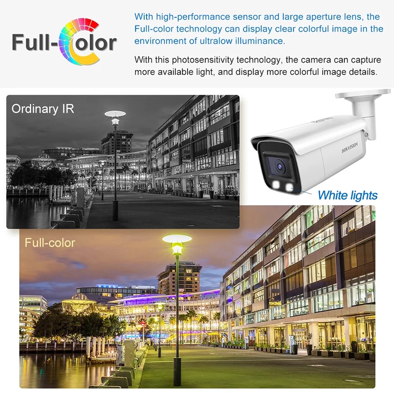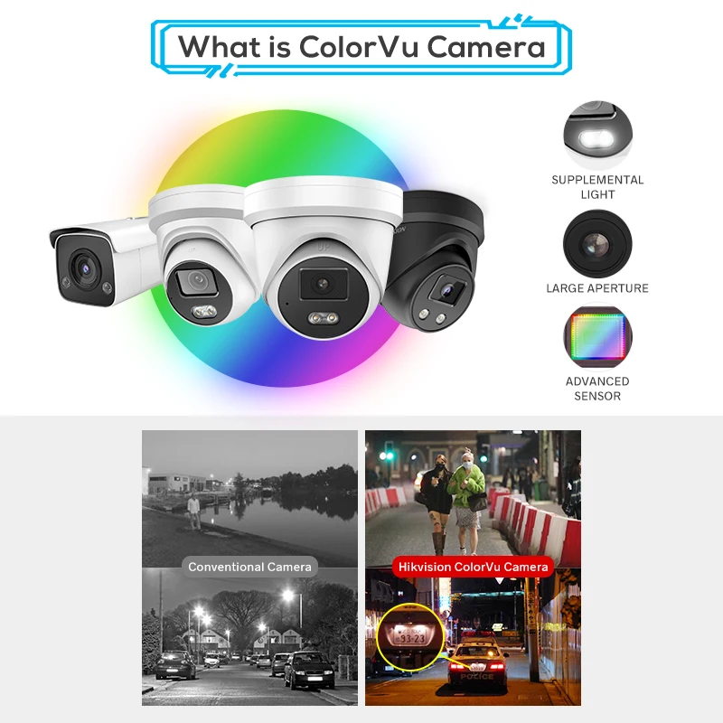 1. Hikvision ColorVu cameras 'мощная способность улавливать детали при низком освещении происходит от двух конкретных прорывов в аппаратных технологиях: передовые линзы и высокопроизводительные датчики. В сочетании с дополнительным светильник для экстремальных темных сценариев, камеры ColorVu гарантируют видео с красочными деталями, когда они вам нужны.