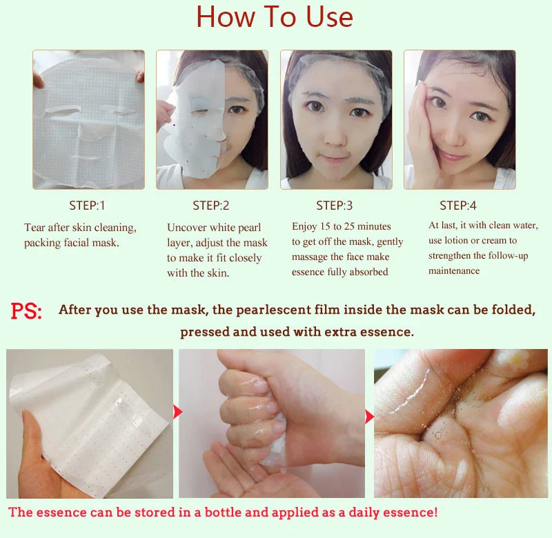 Шаг: 1 слеза после очистки кожи, упаковка маски для лица.Шаг: 2. Откройте белый жемчужный слой, Отрегулируйте маску, чтобы она плотно прилегала к коже.Шаг: 3 Наслаждайтесь 15-25 минут, чтобы снять маску, мягко массируйте лицо, чтобы эссенция полностью впитываласьШаг: 4, наконец, с чистой водой, используйте лосьон или крем для укрепления последующего обслуживанияPS: после использования маски перламутровая пленка внутри маски может быть сложена, прижата и использована с дополнительной эссенцией.Эссенцию можно хранить в бутылке и применять в качестве ежедневной эссенции!