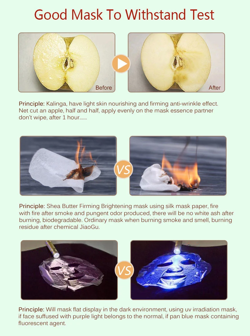 До и послеПринцип: Kalinga, имеет светильник, питательный и укрепляющий эффект от морщин. Отрежьте яблоко, половину и половину, равномерно нанесите на маску эссенция партнера Дон & # x27;t протрите, через 1 час ..VSПринцип: масло ши укрепляет осветляющую маску с помощью шелковой маски бумаги, огонь с огнем после дыма и резкого запаха, не будет белого золы после сжигания, биоразлагаемые. Обычная маска при сжигании дыма и запаха, сжигание остатка после химического JiaoGu.VSПринцип: будет маскировать плоский дисплей в темной среде, используя УФ-маску облучения, если лицо с фиолетовым светильник относится к норме, если Пан Синяя Маска, содержащая флуоресцентный агент.