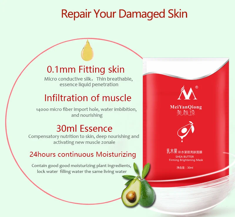 Особенности продукта:Уникальная формула содержит эссенцию масла ши и эссенцию различных растений, с тонкой и мягкой шелковой мембраной, быстро восстанавливает влагу и питательные вещества кожи, экстракт Масла Ши может быть нежной и деликатной кожей для улучшения сухого, грубого тусклого, разбавления тонких линий, осветления цвета кожи. Предотвращает преждевременное старение кожи, уход за кожей увлажнение.Состав:Вода, пропиленгликоль, глицерин, экстракт лакрицы (глицирхиза ураленсис), экстракт олерацеи портулака, экстракт авокадо (бутиросперми паркии), экстракт жира, экстракт алоэ, аминокислота, нипирцианит 3-0-этил аскорбиновая кислота, ксантановая резинка, гиалуронат натрия, метил изотиазолинон, вкус.