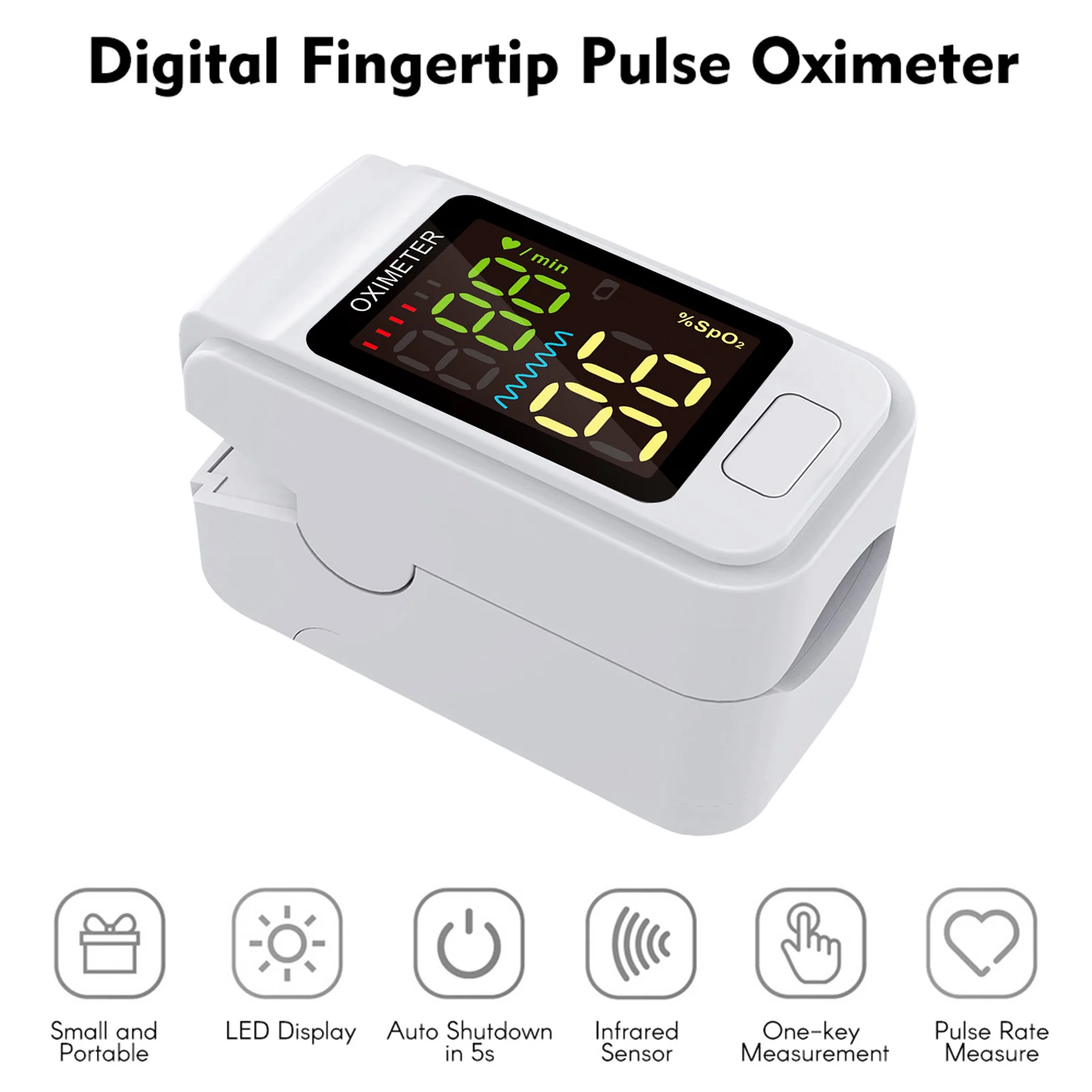 Пальцевой Пульсоксиметр является экономичным и точным методом для обнаружения пульса и насыщения крови кислородом пальцем. Маленький размер, легко носить с собой. Подходит для ежедневного использования, измерения Вашего здоровья в любое время.Особенности:Многофункциональность:Цифровой Пульсоксиметр может использоваться для измерения частоты пульса, уровня насыщения крови кислородом.Легко читать:Поддержка SPO2, pulse и bar chart, вы можете просматривать свой результат очень четко с oled-дисплеем.Простота в использовании:Аккуратная и надежная работа одной кнопкой, Просто прикрепите его к пальцу и включите его при нажатии кнопки. Автоматическое выключение после 8 с, когда не используется.Широко применимый:Подходит для повседневного использования. Широко используется в семье, кислородном баре, физическом уходе в спорте и т. д.Компактный размер:Оксиметр легкий и портативный.Характеристики:Модель: SO 911Цвет: белыйМатериал: пластикРежим отображения: 0,96 дюймаРазрешение дисплея: 128*64Измерение уровня кислорода в крови диапазон: 70 ~ 100% (разрешение составляет 1%)Измерение уровня кислорода в крови точность: 70 ~ 100%, ± 2%, менее 70% не определенДиапазон измерения пульса: 30bpm ~ 250bpm (разрешение 1bpm)Точность пульса: ± 2bpm или ± 2% к максимумуКруг обновления данных: 0,25 s-2sSpO2 PR Средняя: 8sИмпульсный звуковой сигнал: поддержкаДиапазон пиковой длины волны: 500 nm-100 нмАвтоматическое выключение: когда палец не вставлен, он автоматически отключится в течение 8 секундБатарея: 2 * батарейки типа "ААА" (не входит в комплект)Рабочее напряжение: DC 3,0 VРазмер изделия: 57,8*31,3*35,9 ммВес изделия: 27 гРазмер посылка: 85*65*40 ммПосылка Вес: 43 гУпаковочный лист:1 х оксиметрРуководство пользователя на английском языке-1 шт.