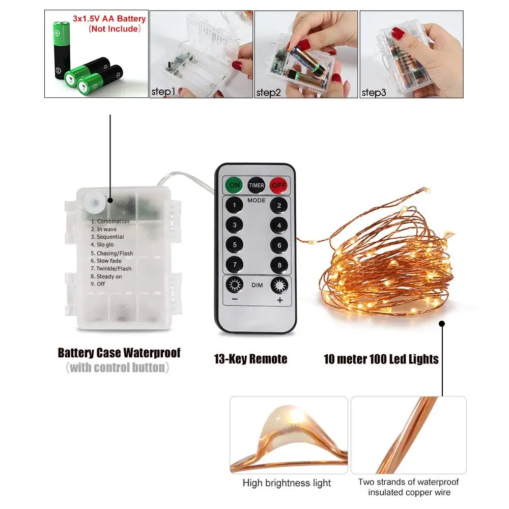 Гирлянда светодиодная, 5 м, 10 м, 20 м, с медным проводом, с таймером, батарея 3AA, 8 режимов, с 13 клавишами, декоративные лампы для свадьбы, Рождества, праздника
