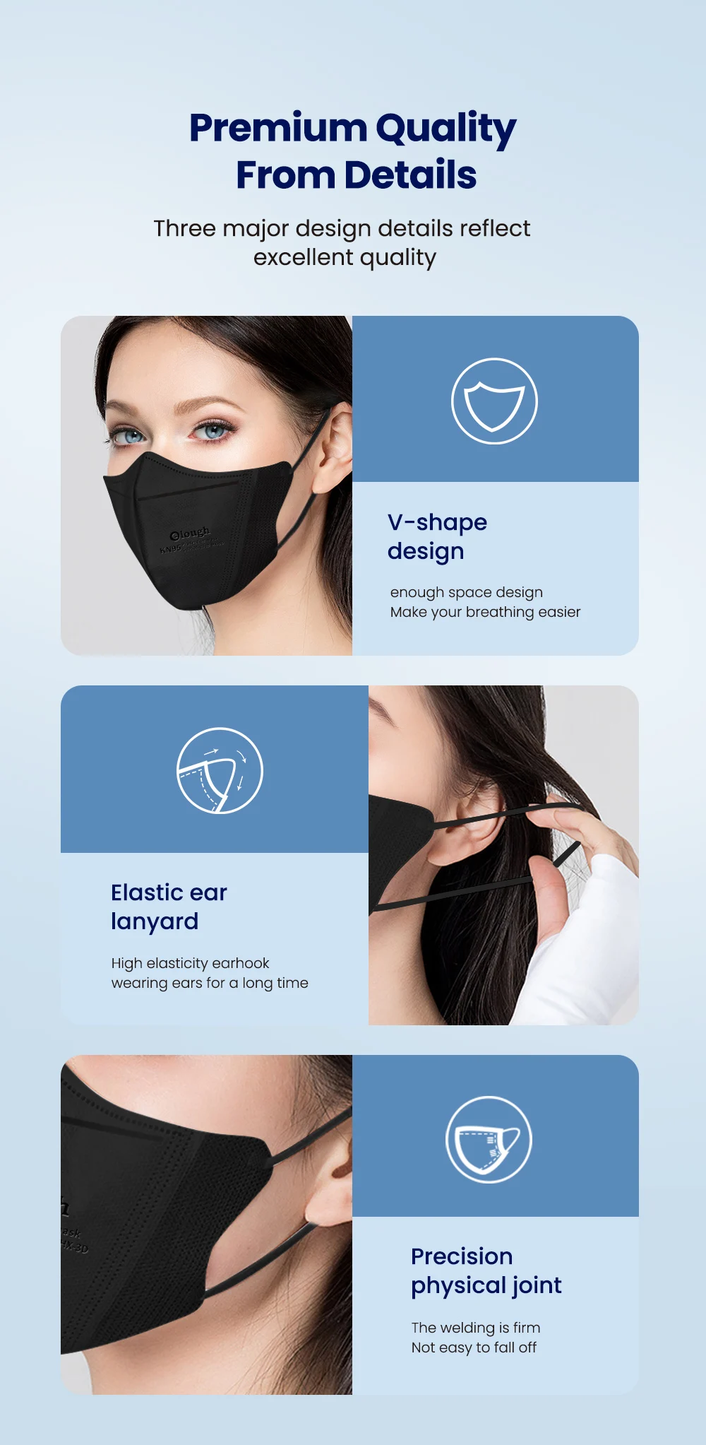 ① Удобно носить.②Хороший эффект фильтрации, особенно для очень мелких частиц и пыли.③ Подходит для различных форм лица.④ Высококачественный защитный эффект. Его защитный эффект такой же, как и маска KN95, европейская маска FFP2.Applicable применяется в различных средах, где защитные маски необходимо носить в течение длительного времени, таких как фабрики, школы, компании, торговые центры, песчаные бури, строительные площадки, больницы, парки и т. Д.⑥Предотвращает запотевание очков при дыхании. 3d-дизайн защищает Макияж лица для женщин с помощью макияжа.
