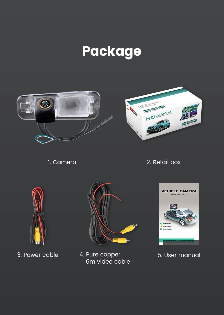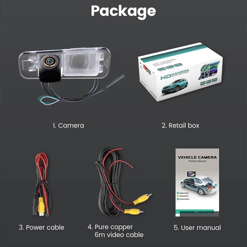 1. Камера заднего вида2. Розничная коробка3. Кабель питания4. Чистый медный 6 м видео кабель5. Руководство пользователя